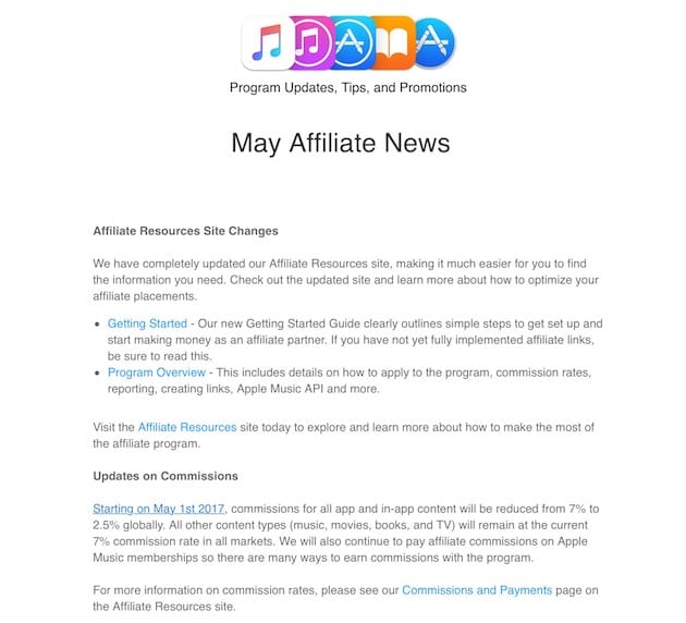 In una mail inviati ai membri del suo programma affiliati, Apple ha comunicato la riduzione che passa dal 7% al 2,5%. “A partire dal 1 maggio 2017” si legge nella mail inviata da Apple, “le commissioni per tutte le app e i contenuti in-app saranno globalmente ridotte dal 7% al 2.5%. Tutti gli altri tipi di contenuti (musica, film, libri e TV) continueranno a offrire il 7% di commissioni in tutti i mercati. Continueremo inoltre a pagare le commissioni agli affiliati per le iscrizioni ad Apple Music e dunque ci sono molti modi di ottenere provvigioni con il programma”.