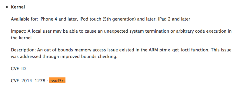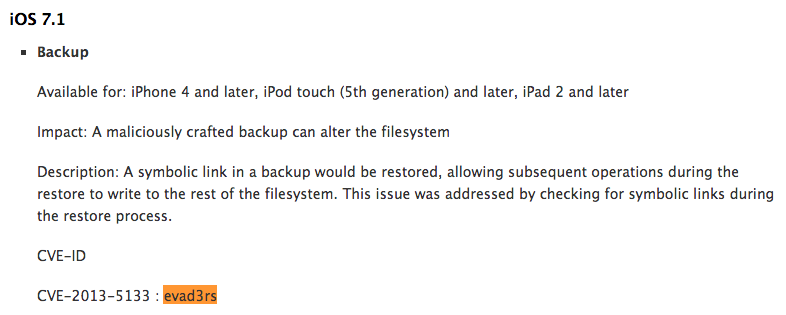 Un bel grazie al team evad3rs per avere dato un contributo alla soluzione di bug di sicurezza ma anche, di rimando, per avere dato una strada per rendere molto più difficile il Jailbreak di iOs 7. Questo quel che, a sorpresa, si trova nelle note che accompagnano il rilascio di iOS 7.1 avvenuto nella giornata di ieri