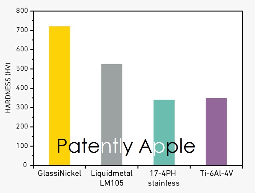 In alcuni esempi di utilizzo, Apple fa riferimento a macchine per lo stampaggio di queste leghe, ma anche a dispositivi di elettronica di consumo citando componenti per smartwatch, protesi, protesi dentali, nuclei ferromagnetici, articoli sportivi e beni di lusso. Un grafico di Glassimetal che riportiamo in questo articolo, evidenzia che il GlassiNickel ha un fattore di durezza superiore rispetto al Liquidmetal LM105.