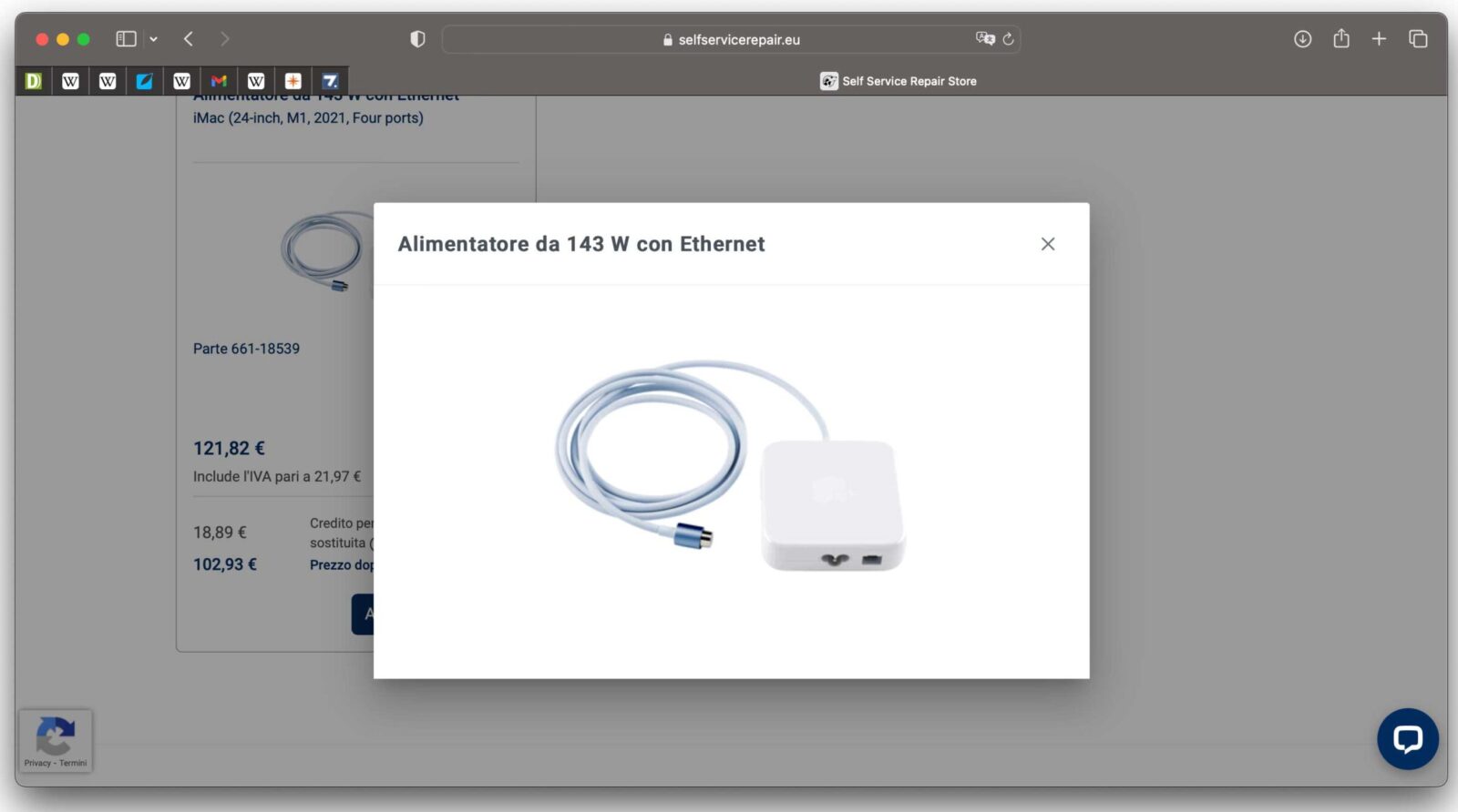 Apple ha aggiornato lo store dedicato al Self Service Repair, negozio online che vende parti di ricambio per iPhone e Mac e ora è possibile acquistare anche l’alimentatore da 143W di iMac 24″ 2021 con chip Apple Silicon M1.