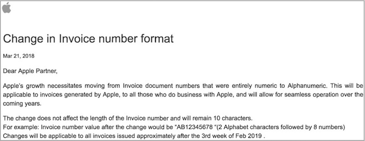 Secondo un post apparso su Reddit, come riporta la redazione di Macrumors, la società avrebbe infatti iiziato a inviare ai propri partner mail in cui spiega nel dettaglio il cambiamento in atto e le ragioni: il numero di prodotti e di ordinativi è stato nel coso degli ultimi anni talmente alto, da aver oltrepassato tutte le possibili combinazioni consentite da un codice numerico a 10 cifre, rendendo necessario l’introduzione di un codice alfanumerico. Quindi far data dal prossimo febbraio 2019 Apple inizierà ad applicare a tutte le fatture emesse un codice del tipo “AB12345678”.