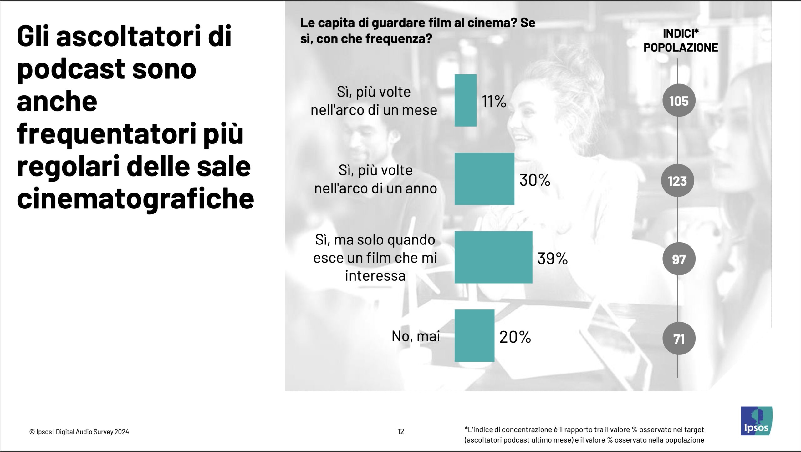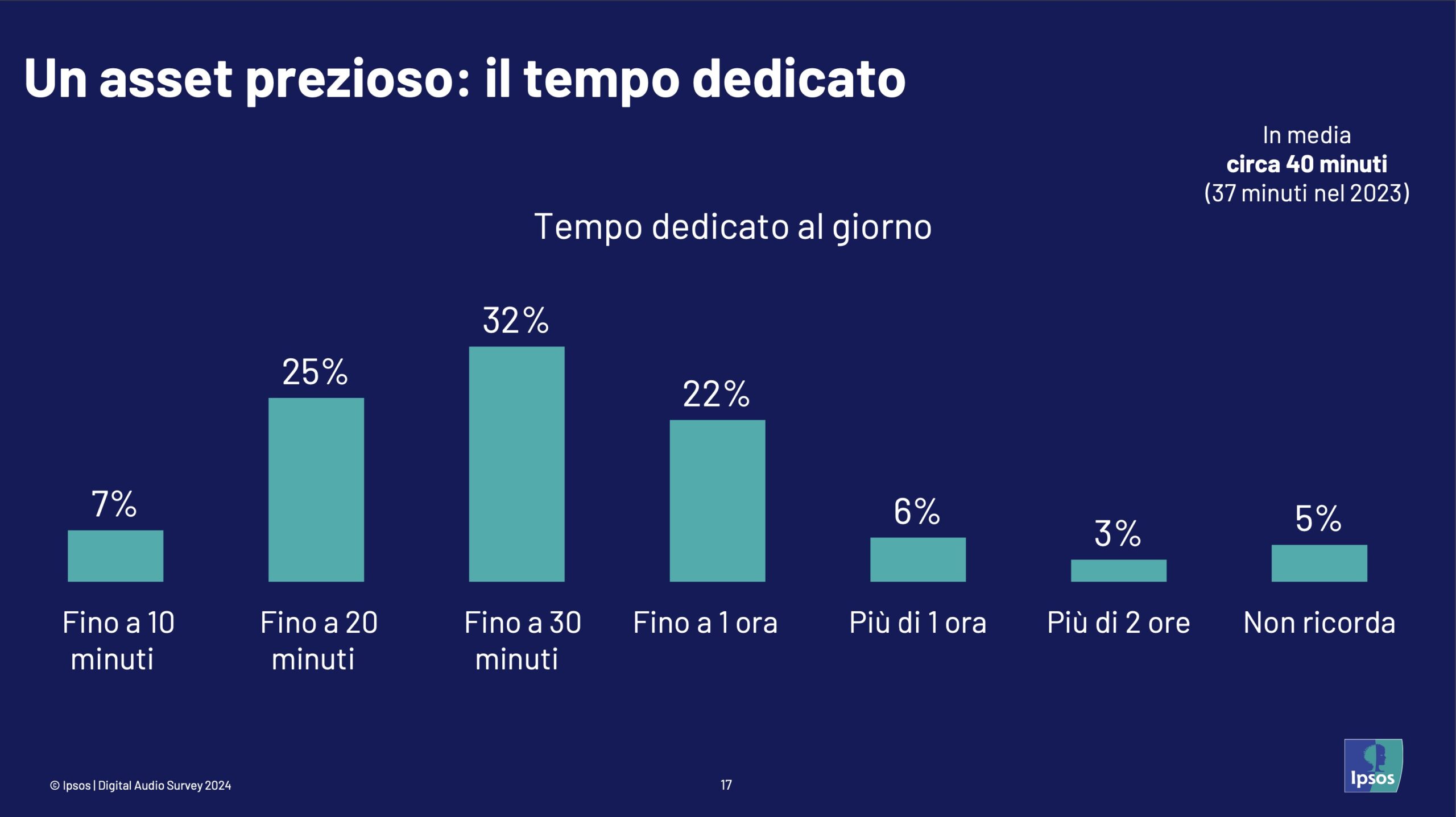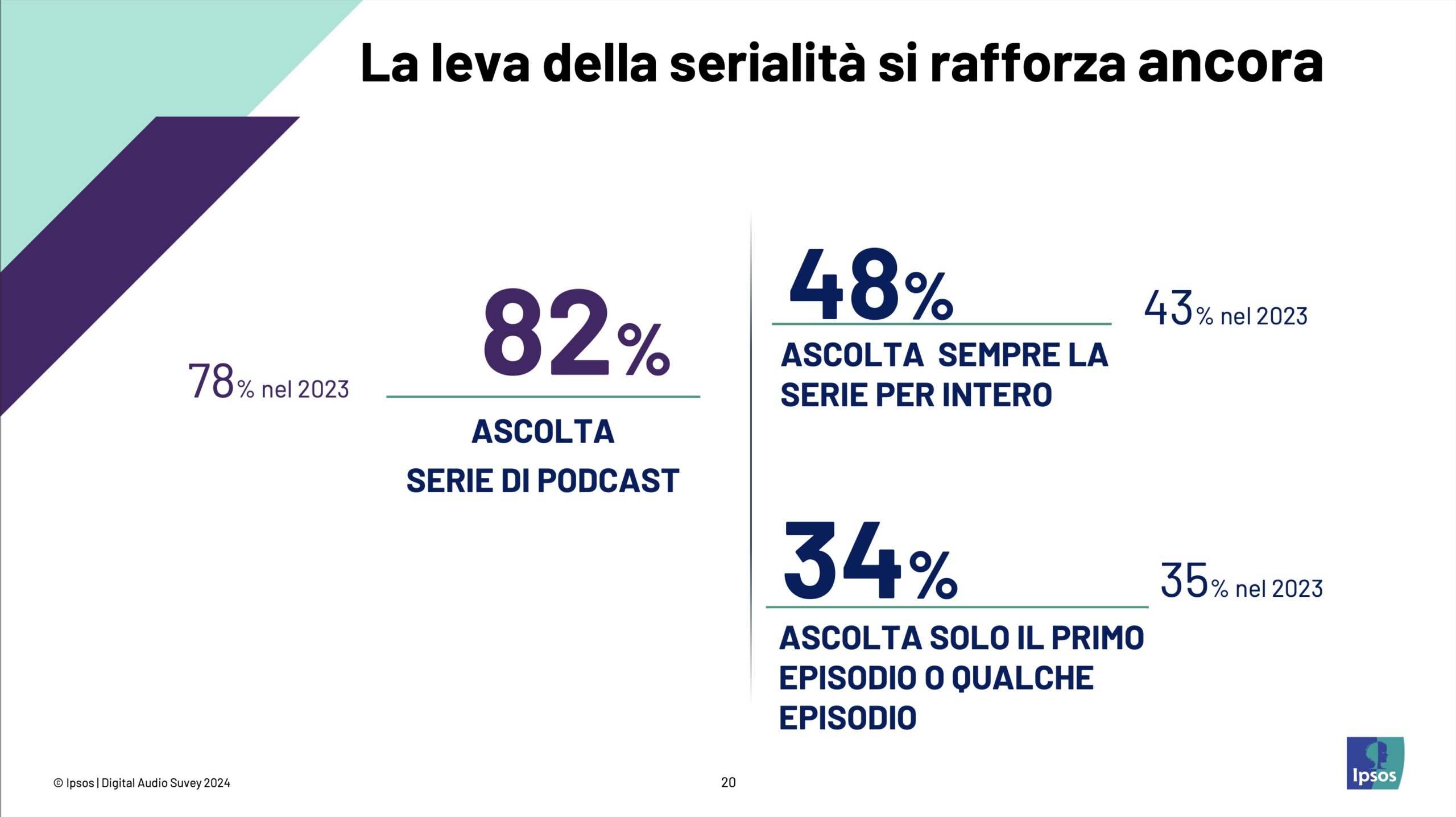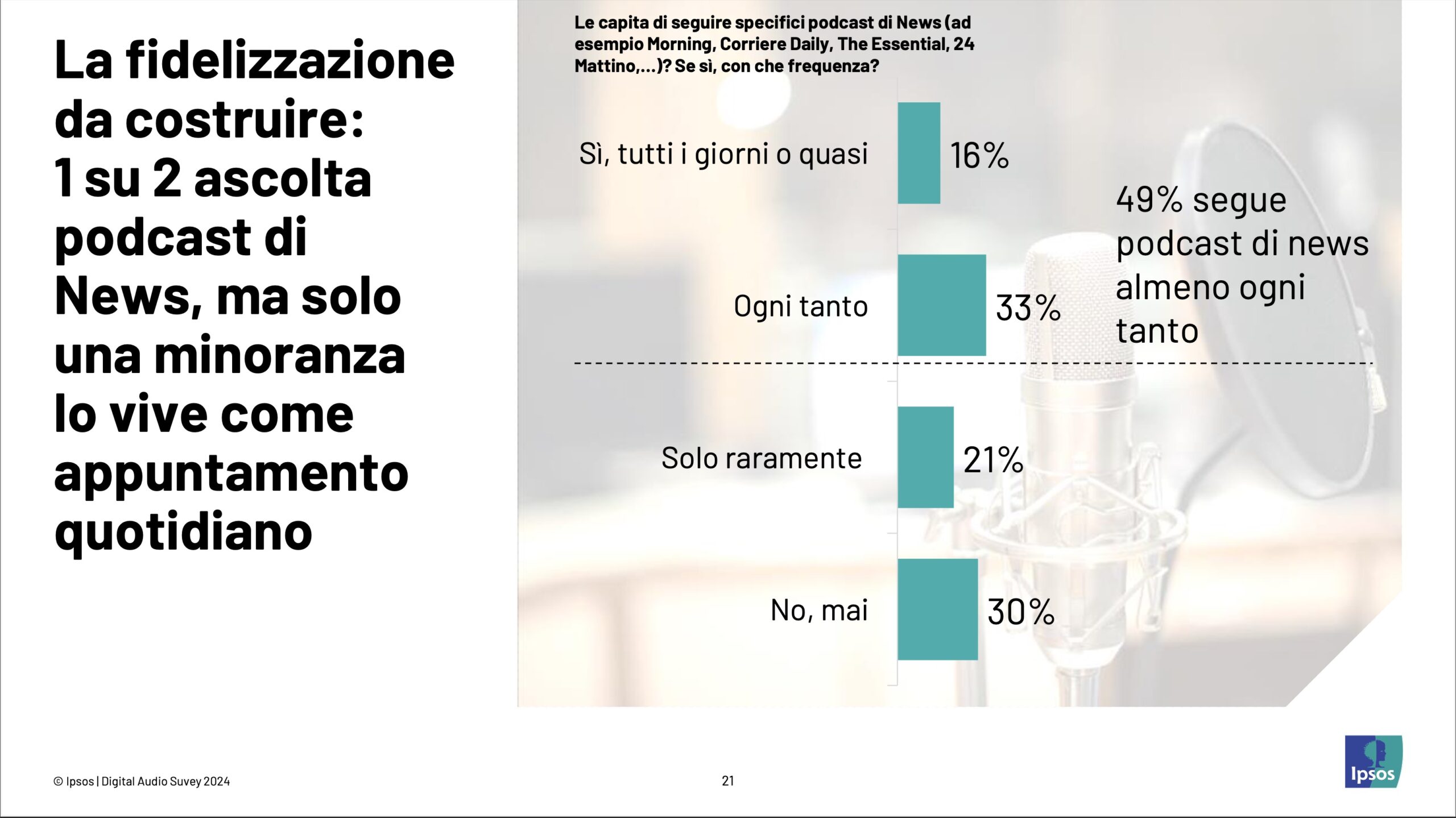 Il centro di ricerca Ipsos conduce uno studio per l’Italia che ci fa capire non solo le dimensioni del fenomeno da noi ma anche le sue caratteristiche e peculiarità. Lo studio è basato su una intervista a campione su alcune migliaia di persone con un questionario che consente di tracciare una fotografia del mercato del podcast italiano. Ipsos utilizza questa ricerca per i suoi clienti commerciali (le aziende potenziali inserzioniste o autrici di podcast aziendali) ma in realtà il dato è interessante in generale.