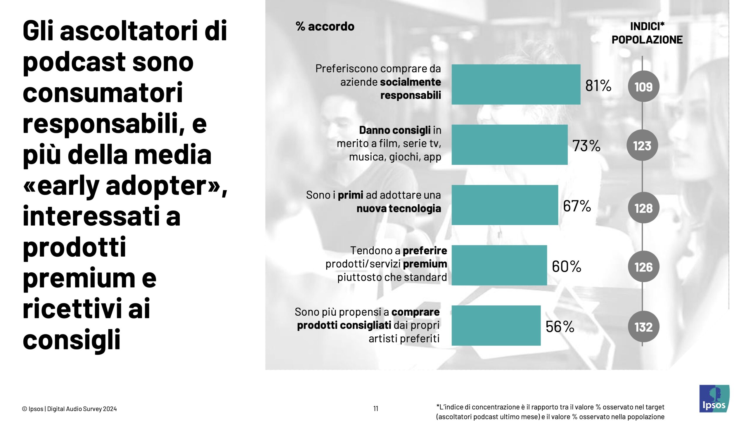 Secondo Ipsos, infine, esistono quattro profili di ascoltatori: i Social First (il 35%, sono giovani, assidui, usano i social per trovarli, seguono gli speaker); la Pull Audience (il 23%, sono giovani adulti, fanno ascolto solitario ma hanno un engagement alto); gli ascoltatori Casual (sono il 22%, sono più vecchi, ascoltano casualmente senza privilegiare né podcast né conduttori, usano lo smartphone e hanno meno engagement, non sono multitasking); e infine gli Addicted (sono il 20%, hanno un mix di età, usano siti e passaparola, molto assidui, cercano le cose, hanno un forte engagement e una forte soddisfazione nei podcast).