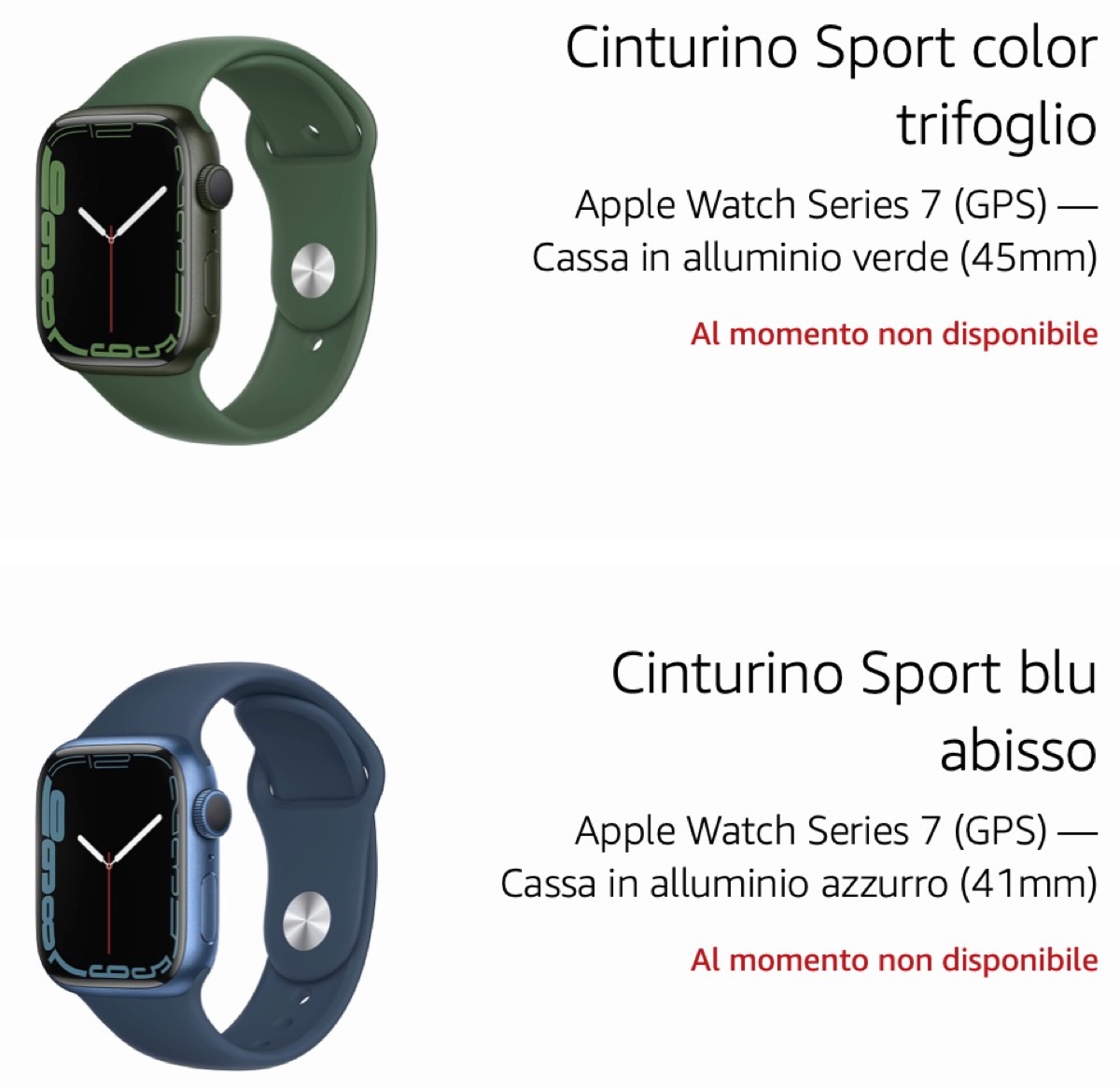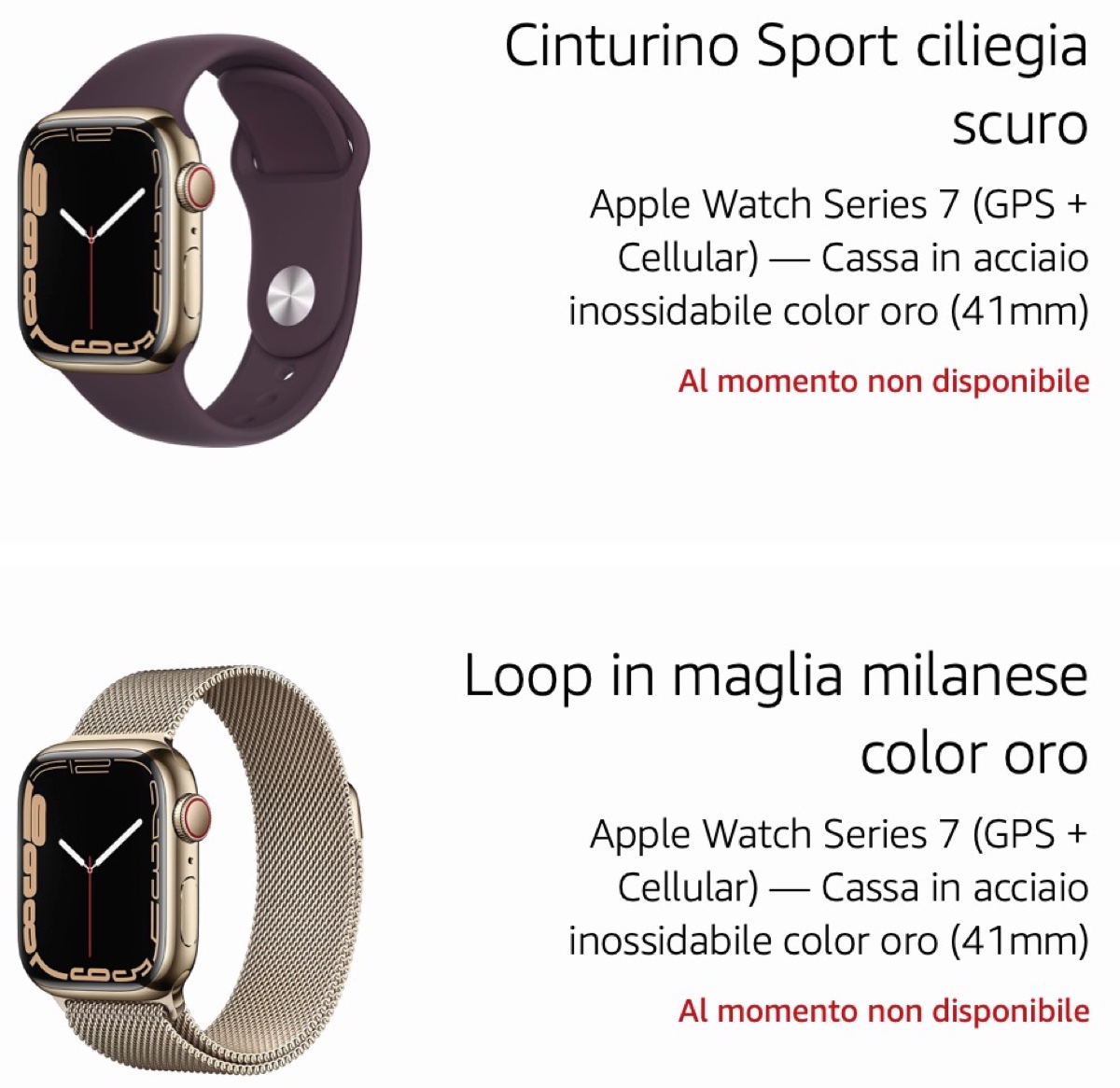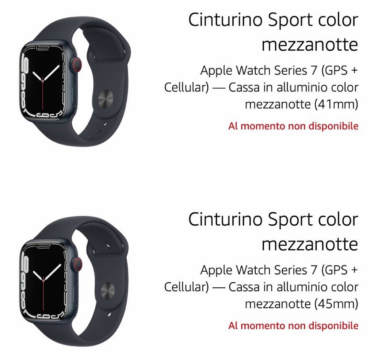 Le due pagine di listini Amazon, da questo collegamento per Apple Watch 7 GPS e invece da quest’altra pagina per Apple Watch 7 con GPS + Cellular sono online e anticipano le configurazioni proposte al lancio, probabilmente con abbinamenti che Apple propone per tutti i suoi rivenditori.