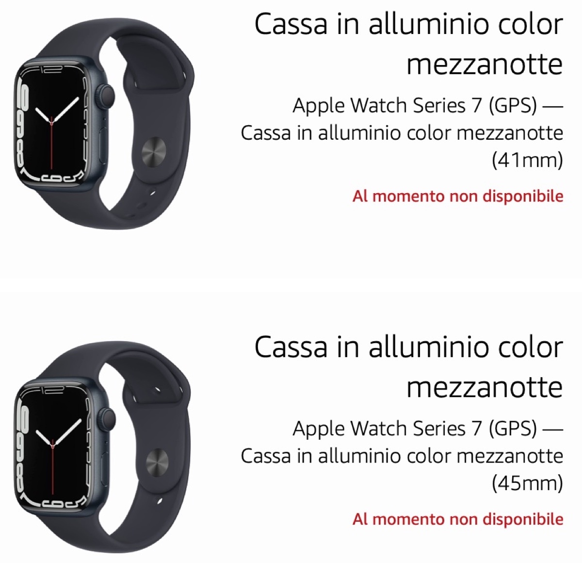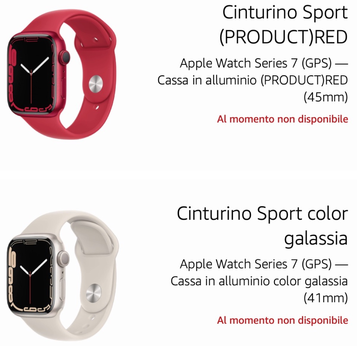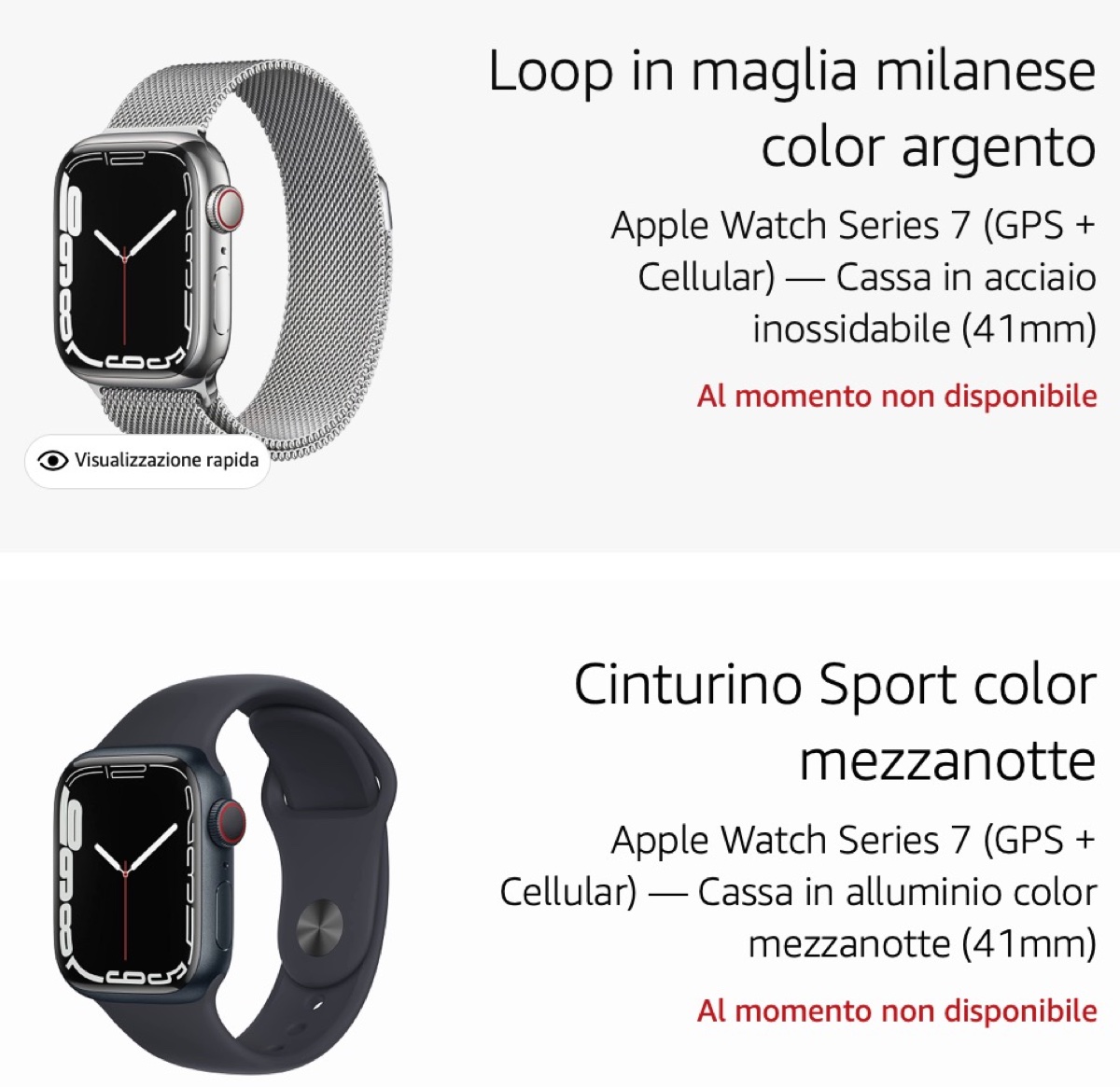 Le due pagine di listini Amazon, da questo collegamento per Apple Watch 7 GPS e invece da quest’altra pagina per Apple Watch 7 con GPS + Cellular sono online e anticipano le configurazioni proposte al lancio, probabilmente con abbinamenti che Apple propone per tutti i suoi rivenditori.