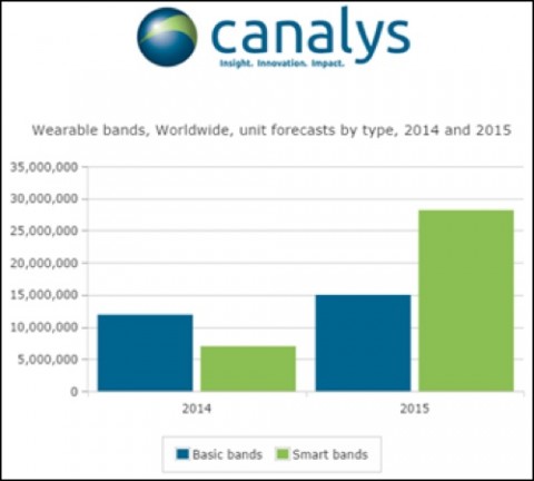 Nel 2015 il mercato degli indossabili crescerà del 129% raggiungendo spedizioni totali di 43,2 milioni di dispositivi. La nuova previsione di Canalys suddivide il balzo della crescita tra i dispositivi con funzioni base, come i bracciali e in generale quelli che non possono eseguire app, per un totale di 15 milioni di unità e quelli realmente smart, in grado di eseguire app, che costituiranno la parte più rilevante di questo business con 28,2 milioni di pezzi.