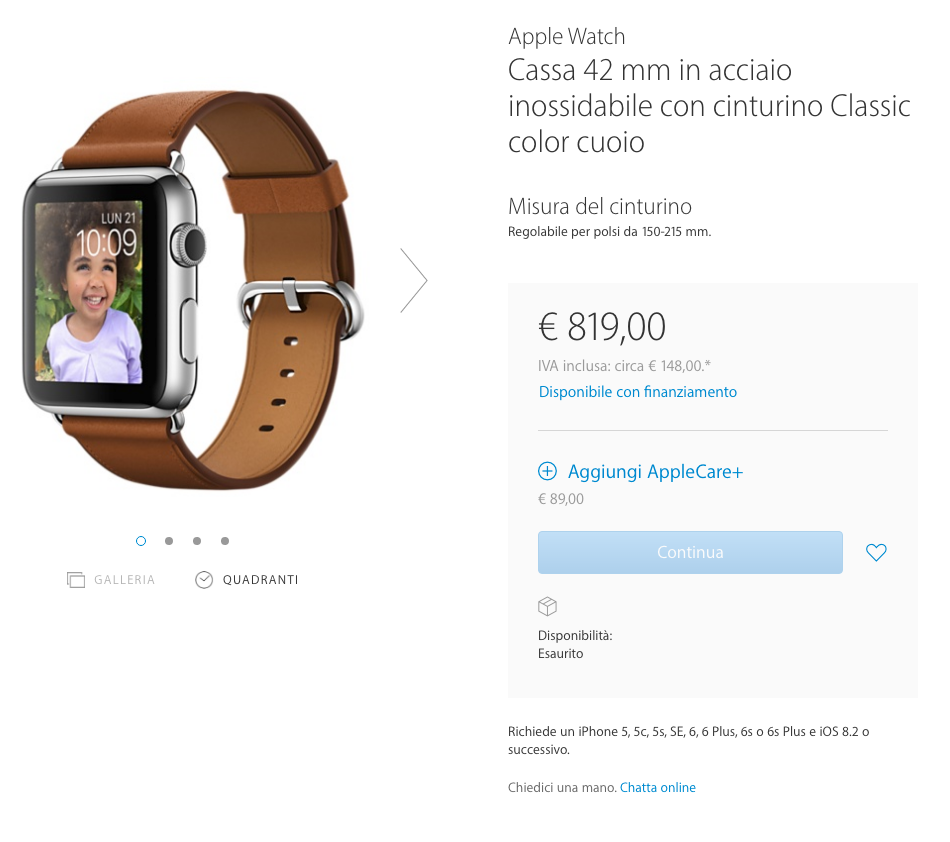 Fra le versioni con cassa in acciaio inossidabile solo una versione è ancora disponibile per l’acquisto, mentre sette sono le versioni con cassa in alluminio disponibili sul sito Apple statunitense. Diversa nelle proporzioni la situazione sul sito Apple italiano: fra gli Apple Watch con cassa in acciaio inossidabile solo tre modelli sono ora esauriti, mentre fra le versioni con cassa in alluminio i modelli esauriti sono sei.