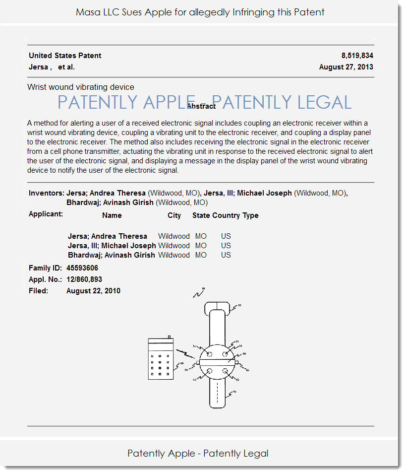 Masa, in quanto titolare del brevetto 8.519.834, cita in particolare un metodo per ricevere e trasmettere segnali elettronici quali messaggi di testo e telefonate su un dispositivo che vibra, che può essere allacciato al polso, e relative funzionalità di allerta che fanno vibrare il dispositivo. Nel brevetto si cita la visualizzazione di messaggi elettronici quali messaggi di testo e la possibilità di visualizzare numeri di telefono associati con la persona che manda i messaggi, funzioni che in qualche modo ricorderebbero gli strumenti che su Apple Watch permettono di ricevere chiamate, email e messaggi.