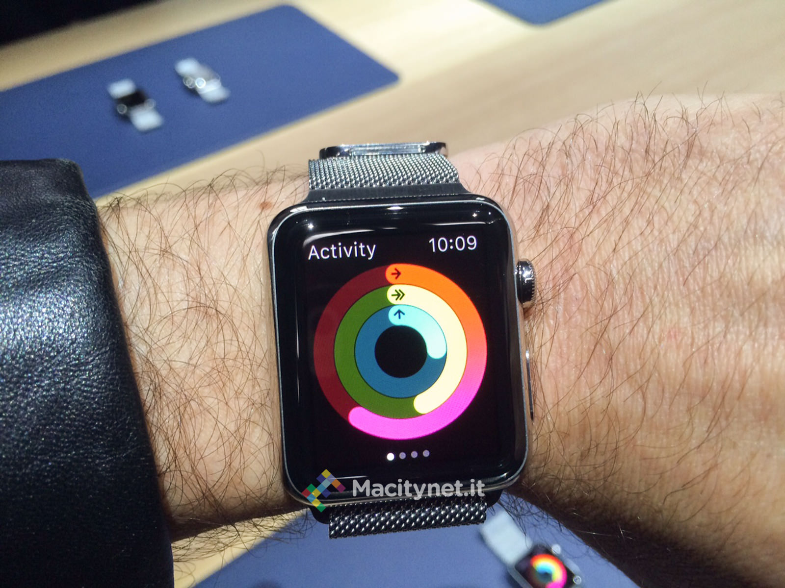 Macitynet ovviamente non ha perso l’occasione di partecipare per dare uno sguardo più da vicino al nuovo dispositivo Apple che si appresta ad entrare nel nuovo mercato che, visti i dati preliminari sulle prenotazioni, sta riscuotendo molto successo tra gli utenti. «Più leggero di quanto si potrebbe pensare», questo quello che si può dire a caldo sulla versione di Apple Watch con cassa in acciaio inox che stiamo indossando in questi minuti. A stupirci a primo impatto è soprattutto il cinturino Milanese, una maglia di metallo molto sottile che sembra lasciar respirare il polso senza stringere, adattandosi con estrema efficacia grazie al sistema di chiusura magnetica.