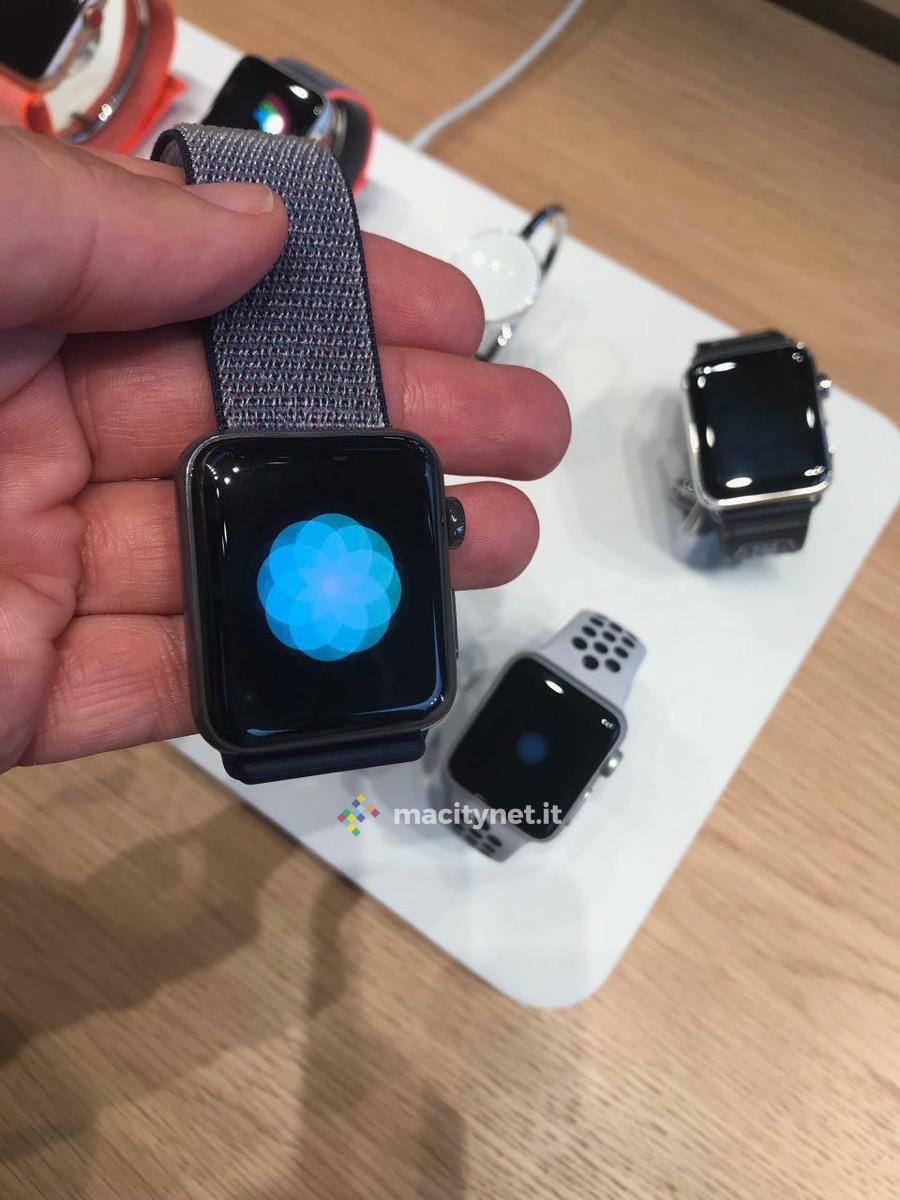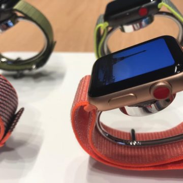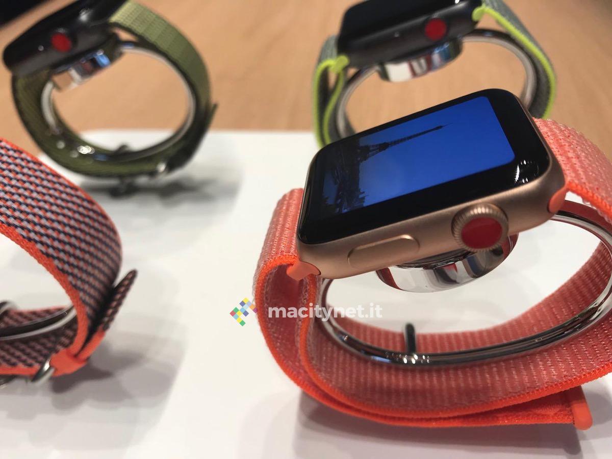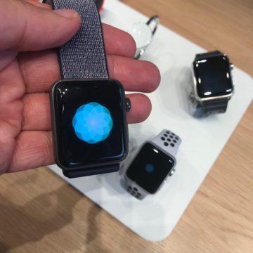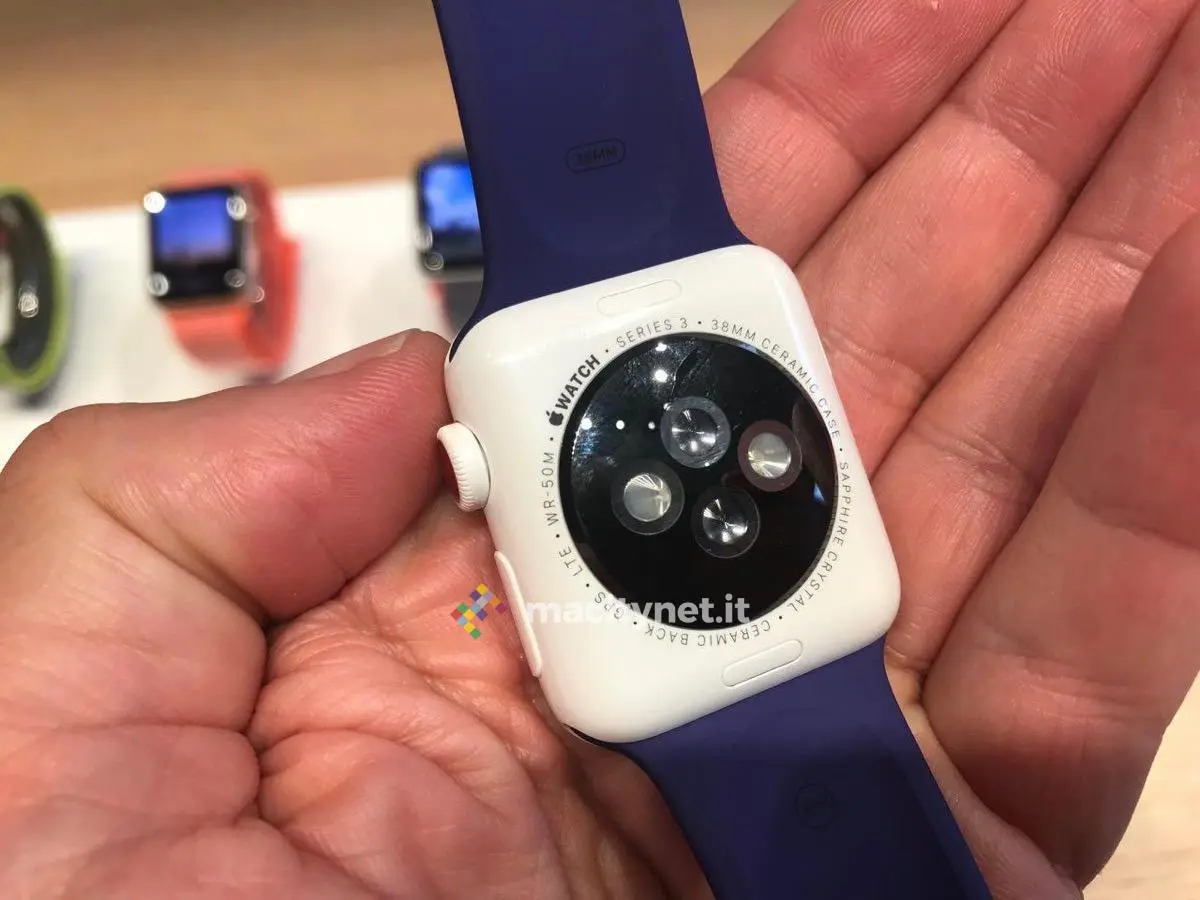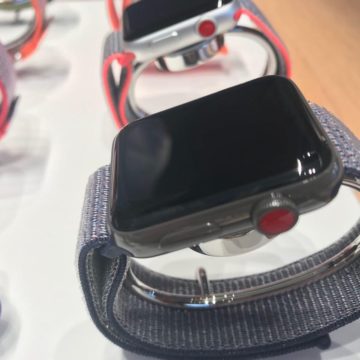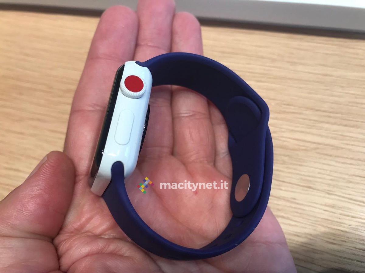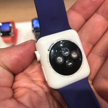 Tra l’altro abbiamo potuto toccare e provare da vicino i modelli LTE in ceramica nelle colorazioni disponibili: Apple Watch 3 GPS + Cellular era mostrato nella versione “Apple Watch Edition” con cassa in ceramica bianca o ceramica grigia abbinata a varie tipologie di cinturini e pure nelle versioni base con tutte le casse e le colorazioni della serie 3 standard: a distinguerli dal resto della compagine l’inconfondibile “bollo” rosso sulla corona.