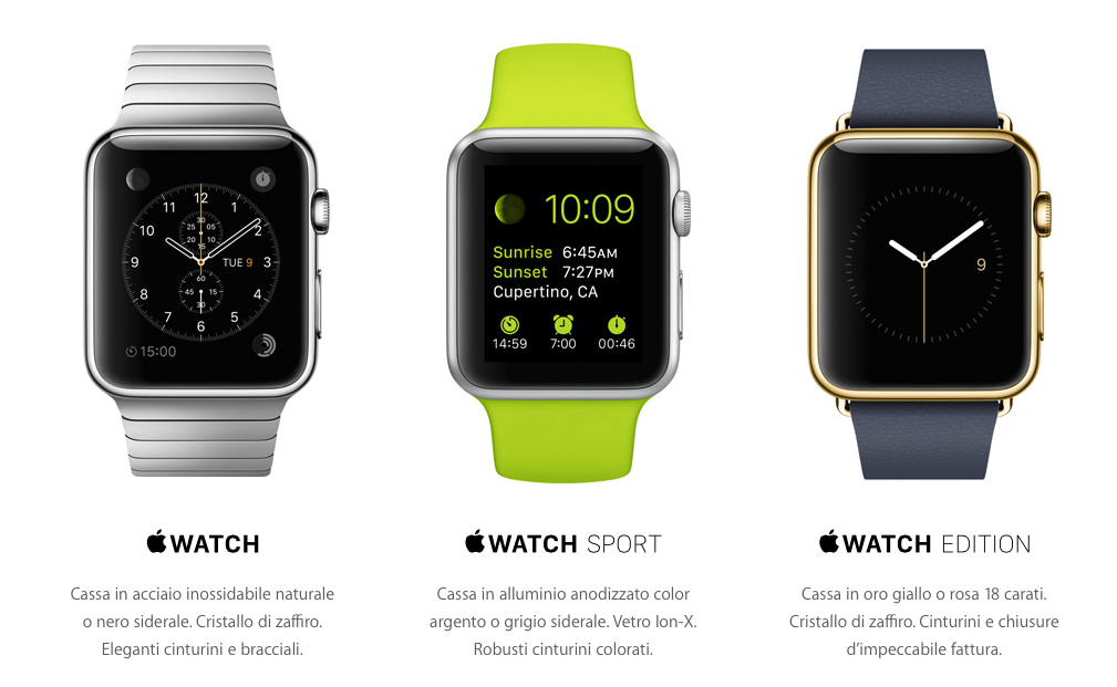 Sappiamo che Apple ha deciso di costruire l’Apple Watch con tre diversi materiali: la versione base ha un corpo in acciaio inox e vetro in zaffiro, il Watch Sport invece ha una cassa in alluminio ed un display in vetro, lo stesso a multi-strati rinforzato che troviamo su iPhone 6 e iPhone 6 Plus il che nel complesso rende il dispositivo più duro ed il 30% più leggero. La versione Watch Edition invece, con il corpo in oro 18 carati è quella più chic, ma anche la più pesante.