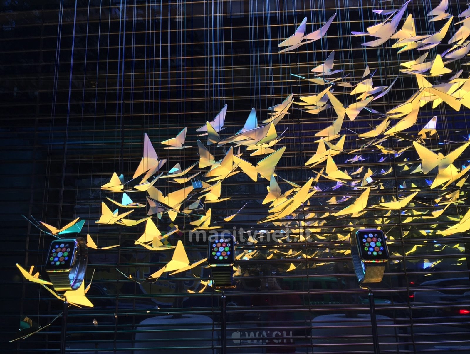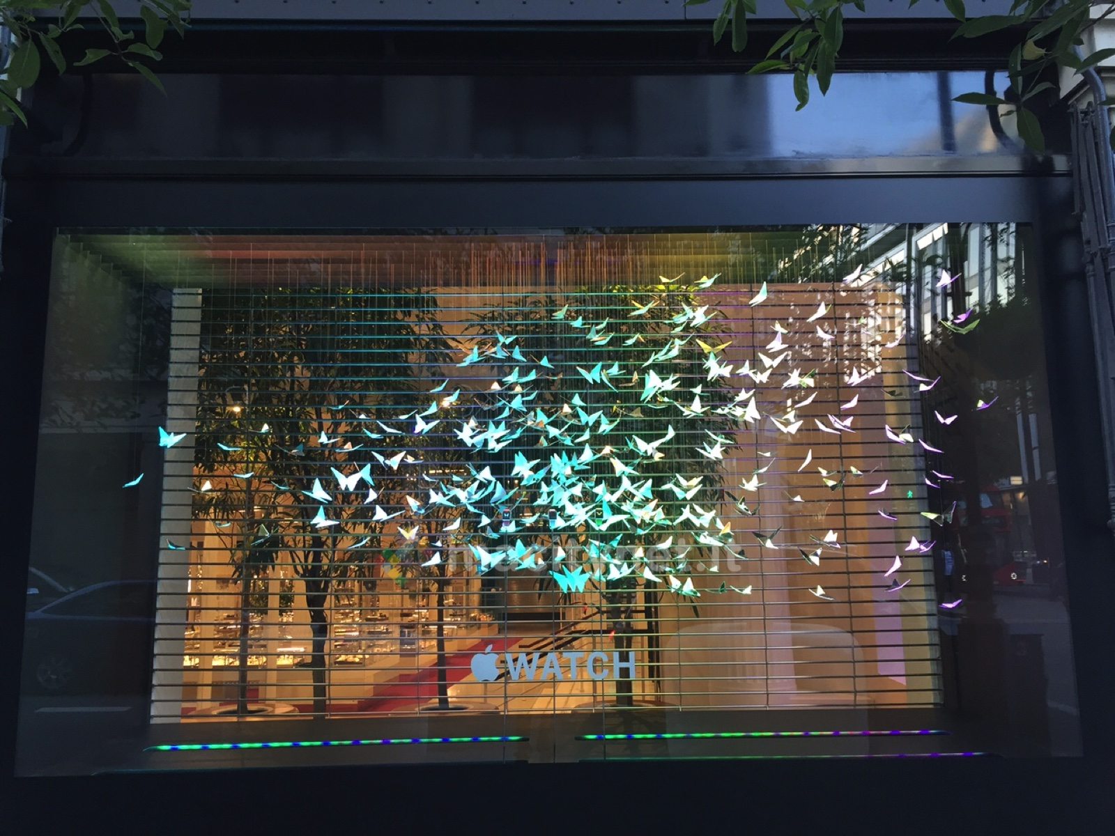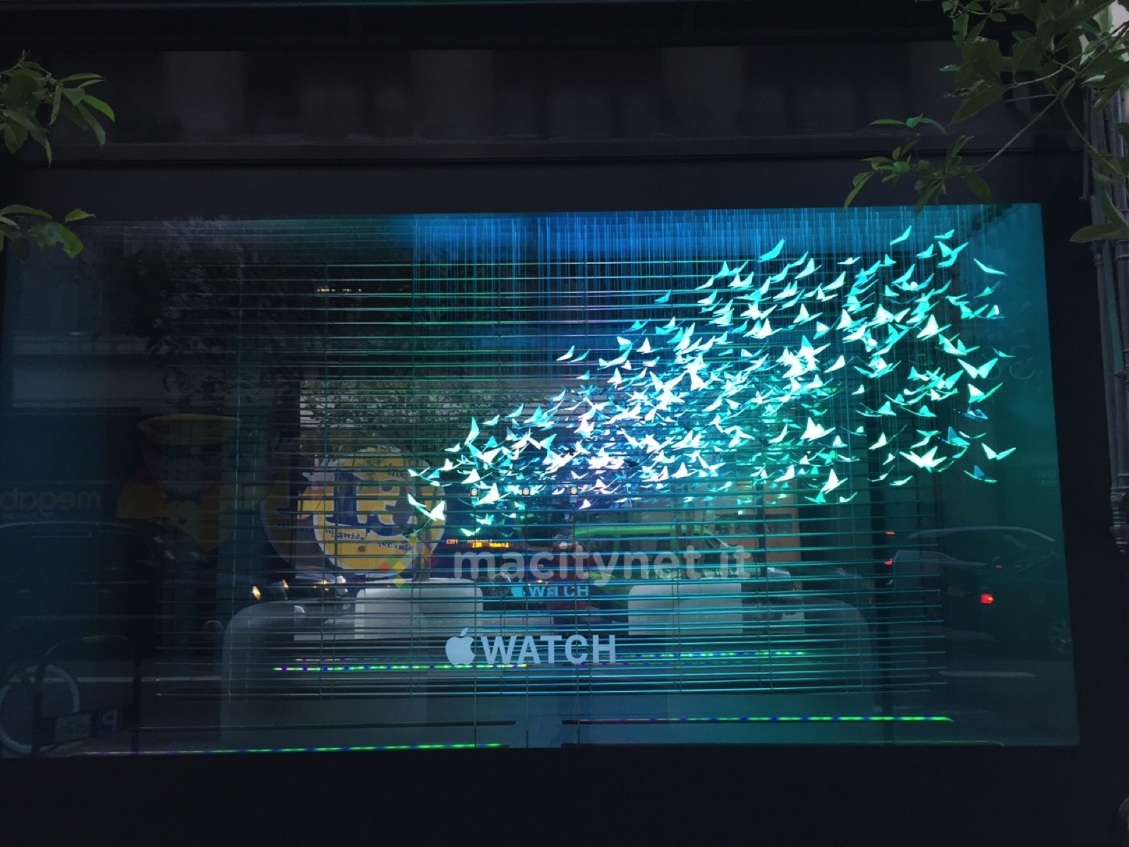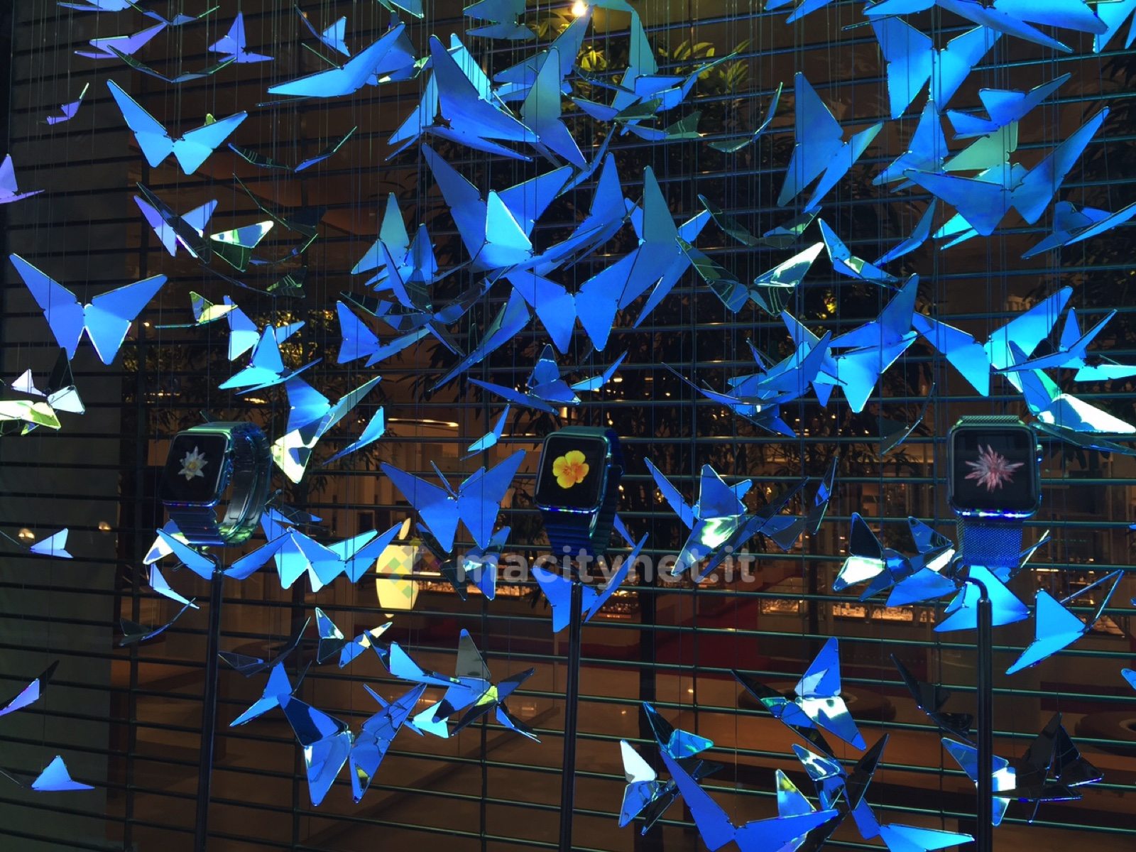 Le farfalle dell’installazione si muovono con la loro superficie riflettente e i colori cangianti per fare da sfondo animato a 3 distinti Apple Watch per ogni vetrina: lo scopo è quello di creare un grande logo con la mela morsicata dall’aspetto mutevole che offre l’idea del tempo che passa. La serie di orologi è ovviamente presente anche all’interno su due tavoli dedicati.