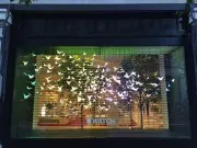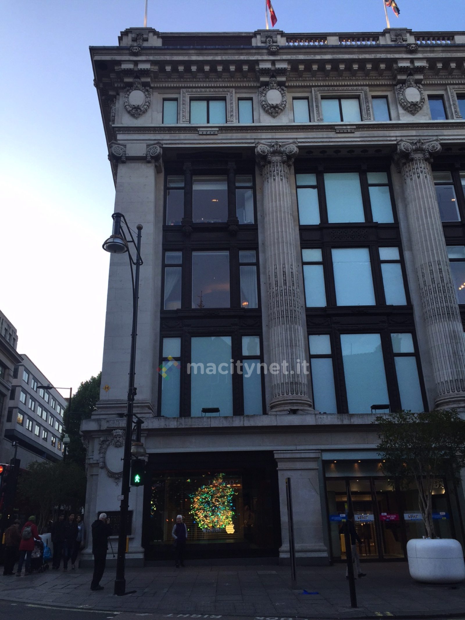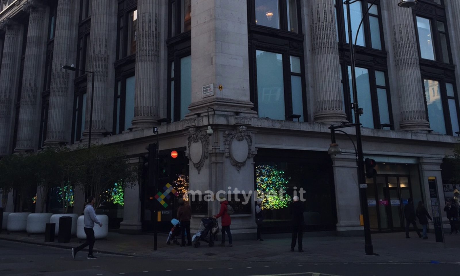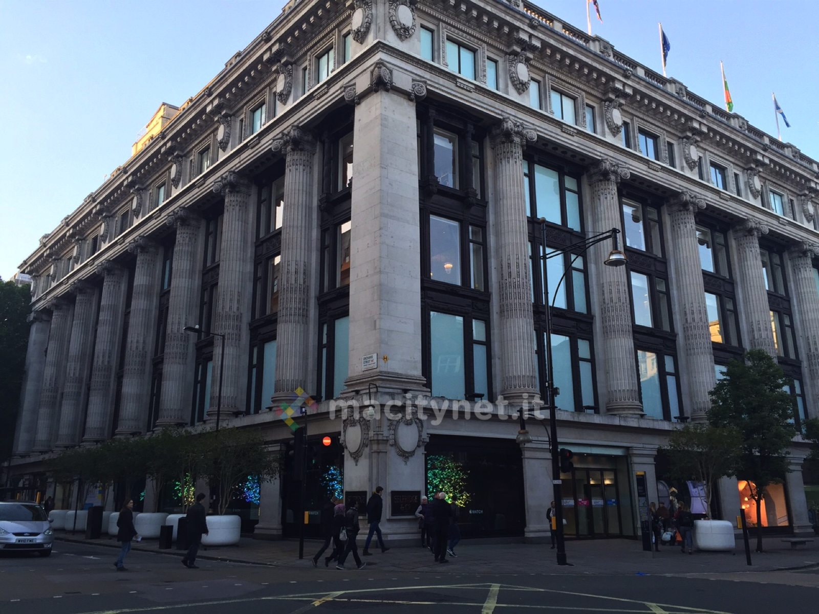 L’idea dell’allestimento è assolutamente originale: forse per richiamare la leggerezza del dispositivo e alcuni dei quadranti utilizzabili nella personalizzazione dell’orario Apple ha pensato di ingaggiare per le frequentatissime vetrine del grande magazzino progettato da Daniel Burnham e che ora si sviluppa su una superficie di 50.000 mq nel centro della capitale del Regno Unito.