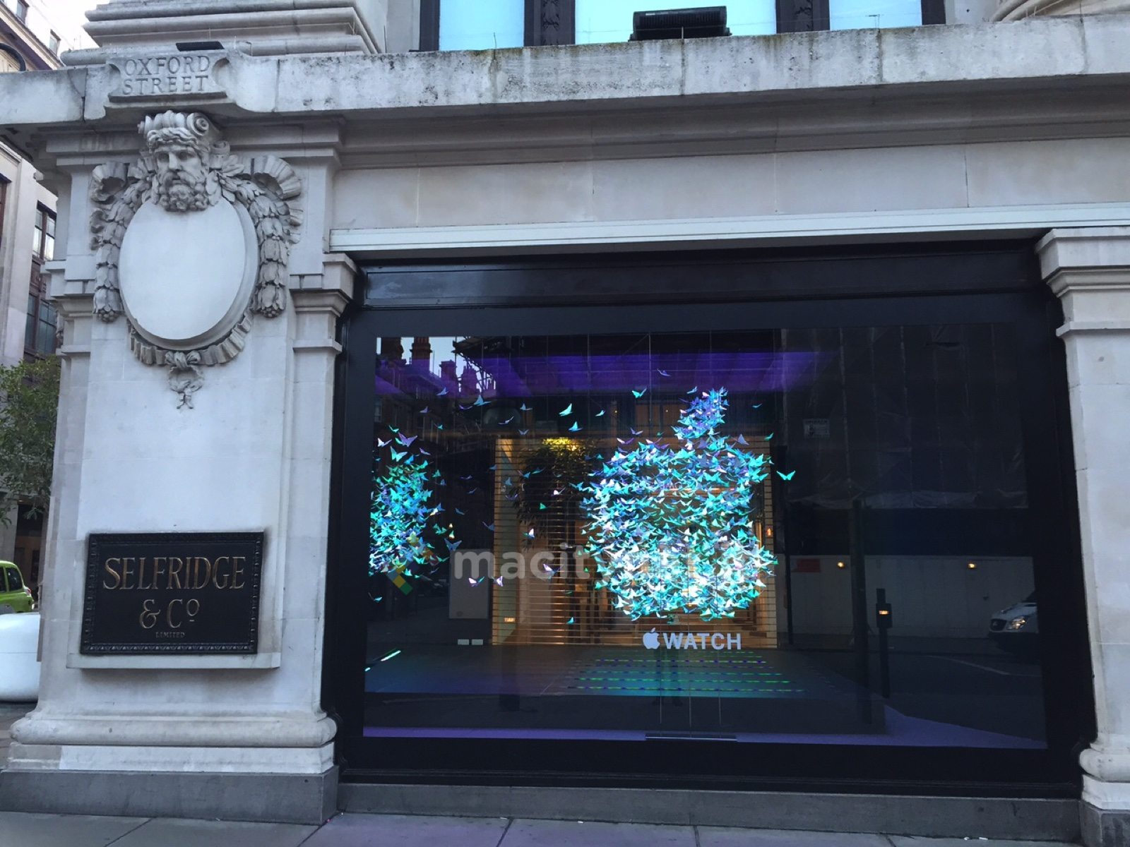 Le vetrine di Selfridges in Oxford Street a Londra hanno dei nuovi protagonisti: sono gli smart watch di Apple circondati da una animata compagine di farfalle colorate che volano dietro le grandi vetrate per formare un’inedita versione del logo Apple.