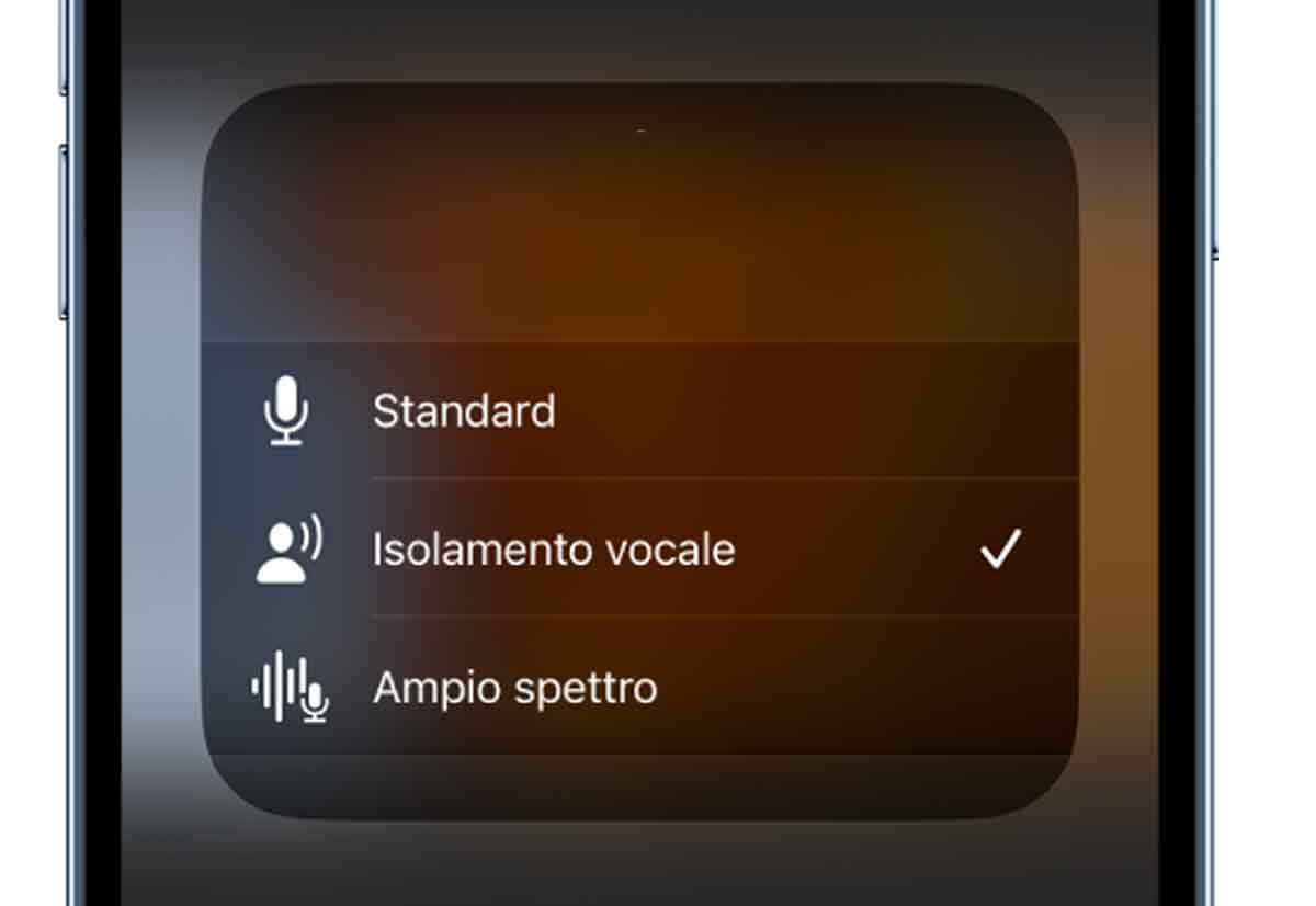 Per attivare le modalità “Isolamento vocale” o “Ampio spettro” durante una chiamata basta scorrere verso il basso dall’angolo in alto a destra dello schermo per aprire il Centro di controllo, da qui toccare Microfono e selezionare “Isolamento vocale” o “Ampio spettro”.