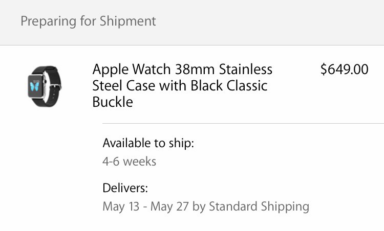 Apple è stata pessimista sulle date di spedizioni di Apple Watch? Pare di sì, almeno stando a quanto riferiscono alcuni clienti americani che hanno comprato lo smartwatch con data di spedizione maggio o giugno e che invece si sono visti segnalare da Apple che i loro acquisti sono in “preparazione per la spedizione”.