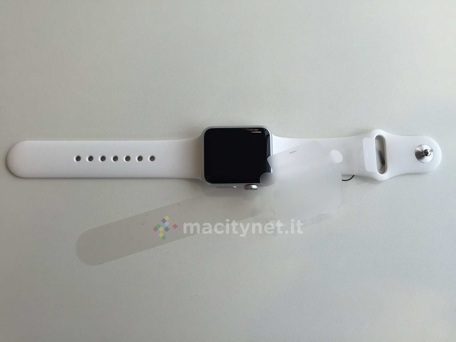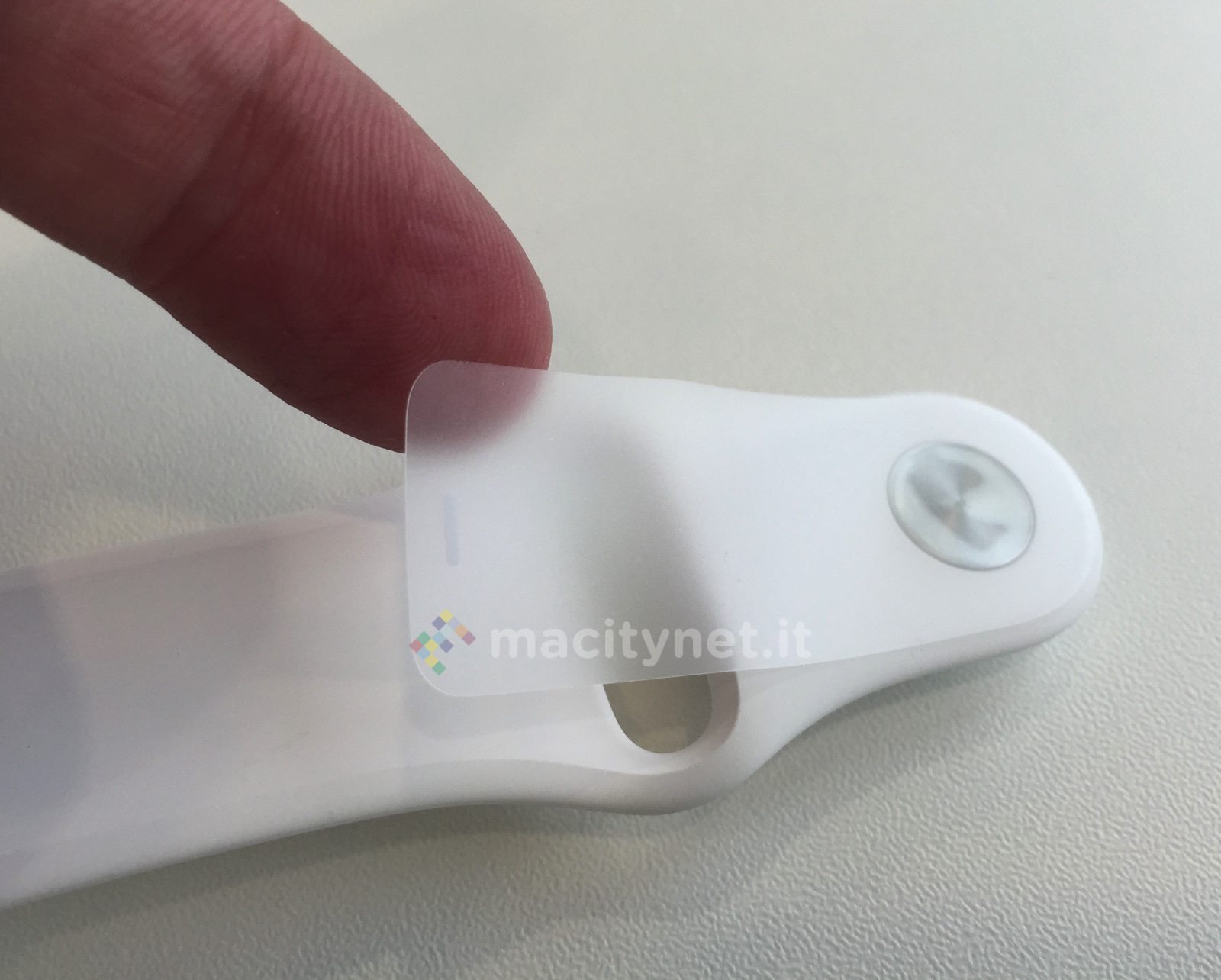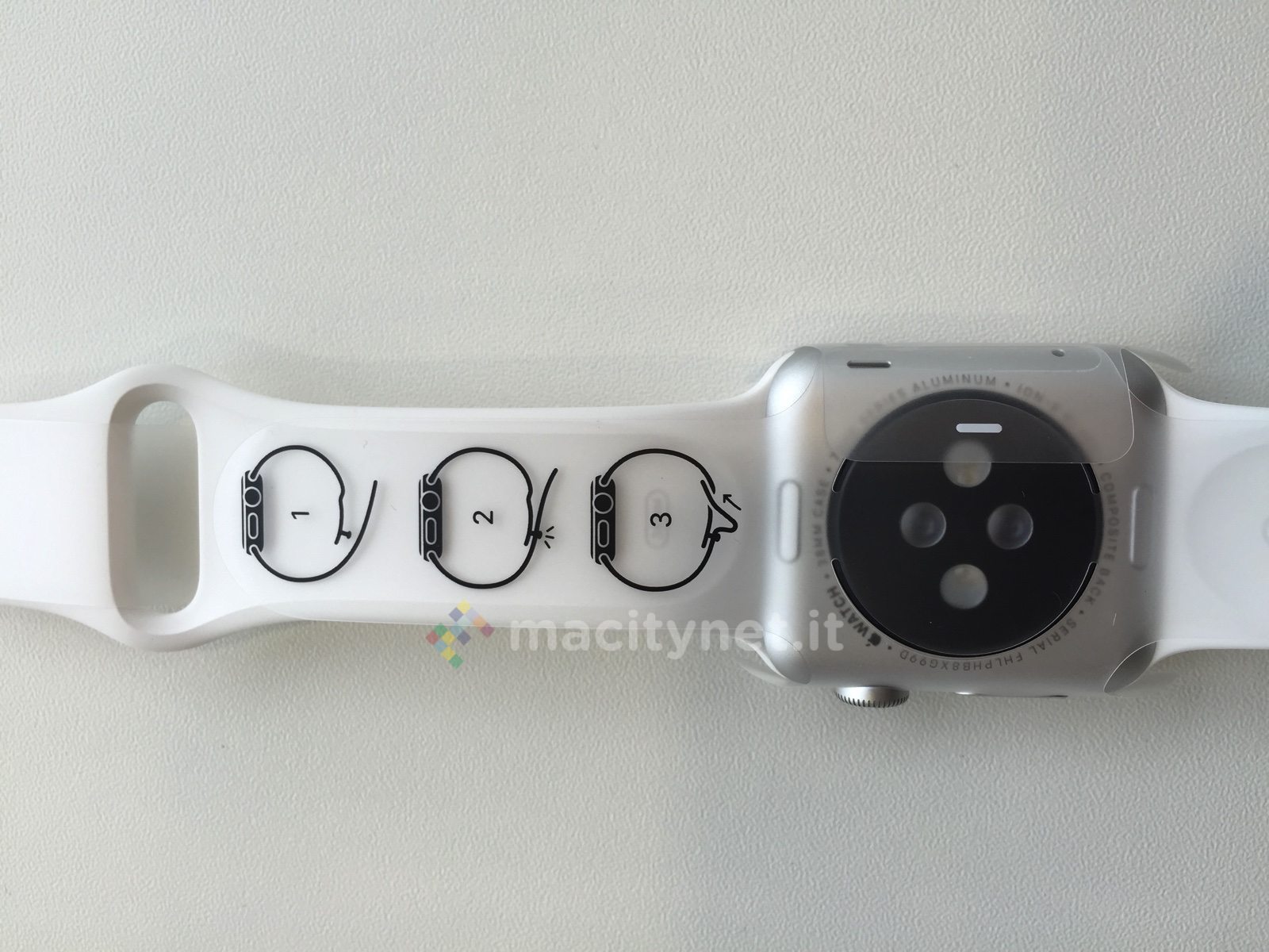 Ecco una serie di foto ravvicinate al modello più economico dei smart watch di Apple in versione con cinturino in silicone bianco. Da notare che anche se si tratta, di fatto, dell’edizione più economica, non manca la classica dura dei dettagli di Apple. Il bracciale presenta anche delle istruzioni per l’uso… Da notare il particolare sistema di aggancio del bracciale stesso, che usa una sorta di perno che si infila nei fori e come se fosse una specie di punzone, e non il classico bracciale con il perno classico.