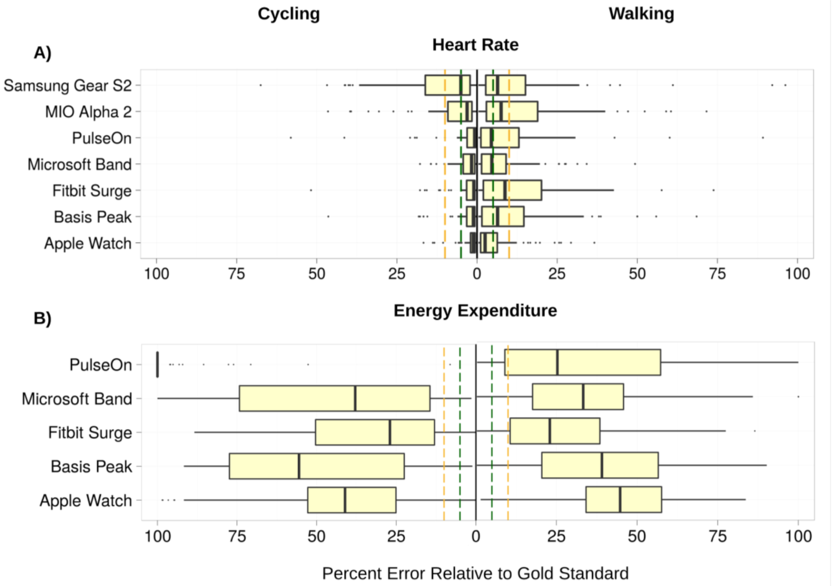 Nelle varie attività Apple Watch si è dimostrato nella frequenza cardiaca il dispositivo con il tasso di errore più basso: mediamente 2% (tra l’1.2% e il 2,8%), mentre Samsung Gear S2 ha evidenziato il tasso di errore più elevato: mediamente 6,8% (tra il 4,6% e il 9%). Ancora, Apple Watch si è dimostrato il dispositivo più accurato nella misurazione della frequenza cardiaca durante le camminate: tasso di errore medio 2,5% (tra 1,1% e 3,9%), mentre gli altri dispositivi hanno evidenziato un tasso di errore compreso tra il 6,5% e l’8,8%.