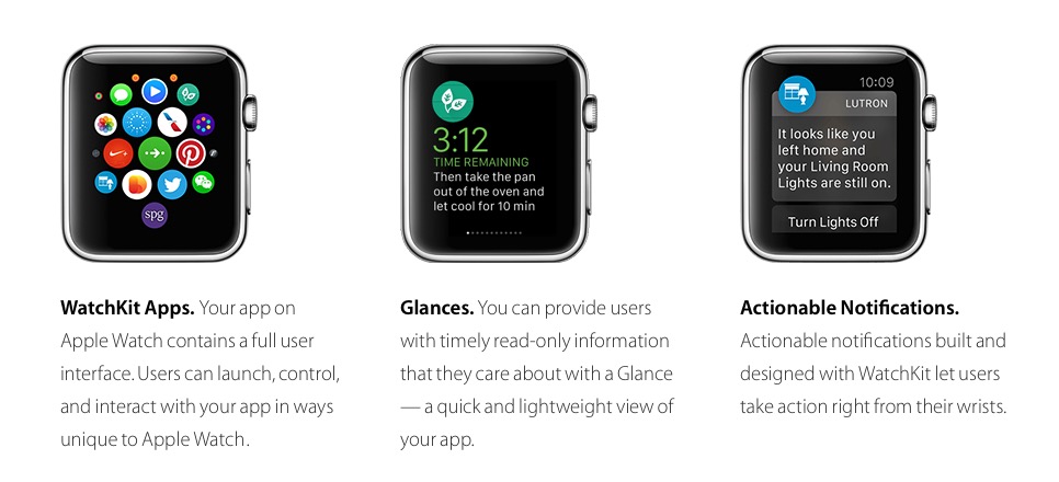 Analizzando più a fondo il nuovo materiale, la prima cosa che viene chiarita è che le applicazioni per Apple Watch saranno solo “di supporto” all’iPhone: non ci saranno sostanzialmente app, eccetto quelle relative a data, ora e cronometro, che lavoreranno senza aver bisogno di comunicare con iPhone. Saranno quindi una sorta di estensione per applicazioni nuove o già esistenti su iPhone, utili per fornire un rapido sguardo ad informazioni relative ad esse direttamente dal polso e senza accedere allo smartphone, almeno fino al prossimo anno: in base infatti a quanto pubblicato dall’azienda attraverso il comunicato stampa ufficiale, dal prossimo anno gli sviluppatori saranno in grado di creare applicazioni completamente native per Apple Watch.