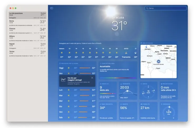 Interessanti anche i dettagli sulle fasi lunari (su macOS bisogna fare click sulla sezione dedicata dell’app Meteo: appare una finestra con dettagli quali: illuminazione, prossima luna piena, distanza e così via. È possibile controllare la fase lunare attuale, scoprire ad esempio quando sarà la prossima luna piena e sfruttare una timeline interattiva per vedere l’evoluzione delle fasi lunari nel corso del tempo.