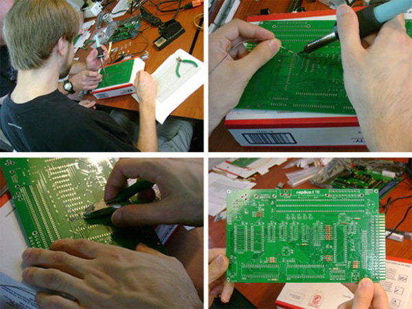 Pur arrivando completo di scheda madre, istruzioni per il montaggio e di tutti i componenti, l’assemblaggio del Replica 1 potrebbe comportare qualche problema per chi pur essendo appassionato della Mela e di retrocomputing non ha dimestichezza con saldatori e componentistica. Per questa ragione in occasione del KansasFest 2009, svoltosi lo scorso mese di luglio, i partecipanti che hanno acquistato un Apple 1 Replica hanno potuto completarne il montaggio seguendo le istruzioni e i consigli offerti dal suo inventore, Vince Breil in persona. Ricordiamo che Apple 1 Replica è una riproduzione autorizzata del primo personal computer della Mela. In questo articolo riportiamo una immagine della corposa galleria fotografica che illustra quasi passo-passo l’assemblaggio dell’Apple 1 Replica.