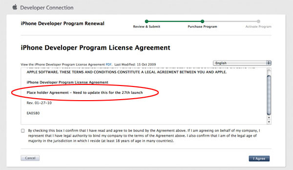 “Occorre aggiornarlo per il lancio del 27” riporta una scritta involontariamente lasciata all’interno dell’IPhone Developer Licence Agreement, in sostanza il contratto che gli sviluppatori devono sottoscrivere con Apple per partecipare allo sviluppo di software per iPhone e touch. Questo segna posto è apparso ieri con un aggiornamento del contratto di licenza e sembra indicare con tutta probabilità l’annuncio di una nuova versione di iPhone OS. Insieme al nuovo dispositivo la Mela presumibilmente toglierà il velo anche dalla nuova versione di iPhone OS, forse indicato con iPhone OS 3.2, in pratica una versione ad hoc del sistema operativo mobile tagliato su misura del tablet.