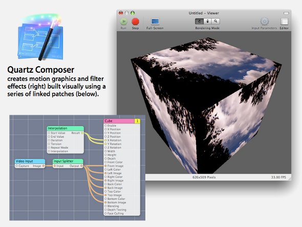 Mac OS X sfrutta gli effetti delle Compositions per tutto: visualizzazione di effetti visivi nei salvaschermo, visualizzazione di effetti grafici in iTunes, transizioni per iMovie, applicazione di filtri ed effetti richiamabili da Photo Booth e iChat.