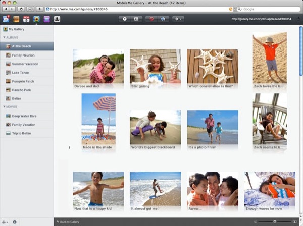 Molto simile ad iPhoto, MobileMe Gallery consentirà di caricare le immagini direttamente da browser, creare album, modificarne l’ordine delle immagini, ruotare i file e cancellare le fotografie che si desidera eliminare, tutto grazie al solo browser ed alle funzionalità integrate.