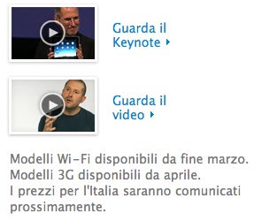 L’Italia è ufficialmente tra i paesi che avranno la versione con connettività  cellulare di iPad a fine aprile. A dirlo è Apple in una nota pubblicata sul suo sito, ora interamente tradotto in nella nostra lingua, dedicato al dispositivo. “Modelli Wi-Fi – si legga sulla prima pagina della sezione dedicata ad iPad – disponibili da fine marzo. Modelli 3G disponibili da aprile”.