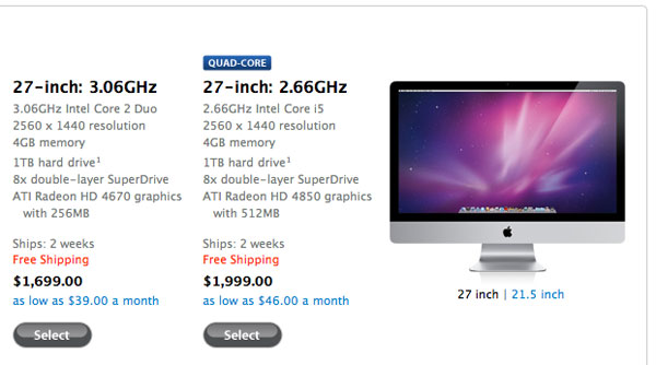 Nel frattempo notiamo che i tempi di consegna per gli utenti che acquistano su Apple Store un nuovo iMac 27″ sono leggermente calati negli Stati Uniti, ora indicati in 2 settimane, mentre rimangono fermi a 3 settimane per gli utenti italiani.