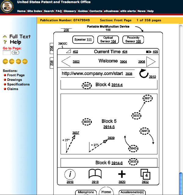Il brevetto-monstre di 358 pagine depositato da Apple è intitolato: dispositivo con schermo sensibile al tocco, e interfaccia grafica utente per determinare i comandi tramite euristica. Nell’elenco dei brevetti che descrivono tecnologie connesse al multi-touch vengono citati documenti che partono addirittura dal settembre del 2006 e molti altri che risalgono al 2007, forse ancora in attesa della registrazione.
