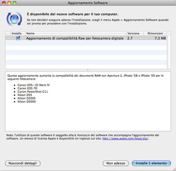 Nelle note di rilascio vengono indicati i modelli Canon EOS-1D Mark IV, EOS 7D e PowerShot G11, mentre le fotocamere Nikon sono D3S, D300S e D3000. Per scaricare l’aggiornamento è possibile utilizzare la funzione Aggiornamento Software del Mac.