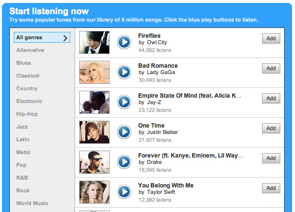 Lala, società  fondata dall’imprenditore californiano Bill Nguyen, opera essenzialmente come una sorta di radio via Internet con canzoni a richiesta. Una volta iscritti si possono ascoltare le canzoni a 10 centesimi l’una; una volta pagata la canzone la si ascolta quante volte si vuole (in qualità  paragonabile a quella della radio) da qualunque computer che abbia accesso al nostro account. àˆ anche possibile creare playlist da mettere on linea a disposizione di altri abbonati Lala. Non manca l’opzione di acquisto di brani a 89 centesimi l’uno. Un volta creata la propria scaletta musicale è possibile metterla a disposizione di altri utenti Lala che possono ascoltare le canzoni via Internet, creando un sistema di social networking molto efficiente.
