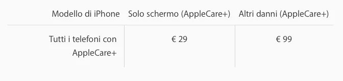 AppleCare per iPhone il cui nome corretto e commerciale è AppleCare+, non è una vera estensione di garanzia. Intorno a questo argomento si è parlato a lungo e ci sono state anche delle querelle di stampo legale che hanno modificato AppleCare trasformandolo una una sorta di servizio assicurativo. Ora include fino a due anni di assistenza telefonica ma comprende anche due interventi a prezzo concordato per i danni accidentali. In altri termini, acquistando AppleCare+, si avranno due riparazioni ai, con i seguenti prezzi: 29 euro per i danni al display, e 99 euro per i danni di altro tipo. Questi prezzi sono validi in Italia, sono comprensivi di IVA, ma nel caso sia necessario spedire l’ iPhone, dovranno essere aggiunti 12,20 euro per le spese di spedizione.