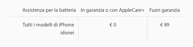 Inoltre, non bisogna dimenticare che AppleCare+ interviene anche per eventuali danni alla batteria. In questo caso, ripararla fuori garanzia costerà 89 euro, mentre con AppleCare+ (o per danni coperti dalla garanzia ordinaria) il costo sarà pari a zero. Ovviamente, stipulare AppleCare+ solo per la batteria non ha senso, dato che il solo costo dell’assicurazione è di 149 e 229 euro, ma se si somma questo vantaggio, a quelli sopra riportati, risulta ancora più evidente il vantaggio di stipulare l’assicurazione AppleCare+.
