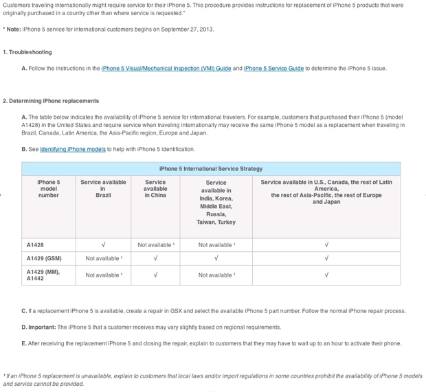Nello stesso documento Apple nota che in alcuni paesi i servizi di assistenza e sostituzione potrebbero non essere disponibili, questo perché alcune versioni dei prodotti Apple, in particolare iPhone, non sono commercializzati in quel paese. L’esempio riportato riguarda appunto iPhone che in Brasile può essere riparato o sostituito solo nella versione A1428. Viceversa questa stessa versione non è disponibile in Cina e così via. Nei principali paesi tuttavia, come in USA, Canada, America Latina, in Giappone e anche in Europa è possibile ottenere assistenza e sostituzione con AppleCare+ per tutte e tre le versioni di iPhone 5 (A1428, A1429 e A1442).