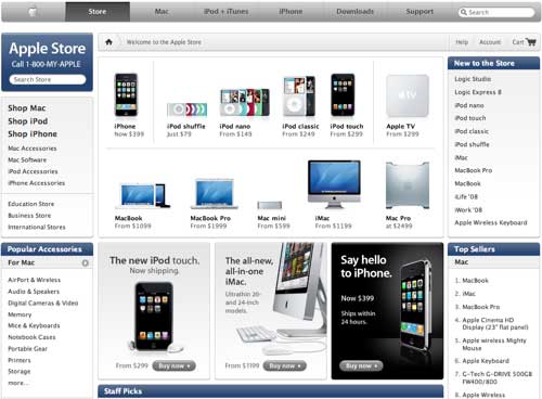 Gli elementi costitutivi sono anche questi, almeno parzialmente, nuovi. Oltre alla vetrina vera e propria che presenta i prodotti più popolari, c’è una fascia con alcuni prodotti in evidenza (nello store americano ci sono iPod Touch, iPhone e iMac) che sovrastano gli “Staff picks”, ovvero i prodotti scelti dallo staff. Ancora più in basso, sotto ad alcuni avvisi “di servizio” dove probabilmente appariranno promozioni, c’è un piede di pagina con i vantaggi che derivano dall’acquisto allo store, le offerte speciali refurbished e i campi per verificare lo stato del proprio acquisto.