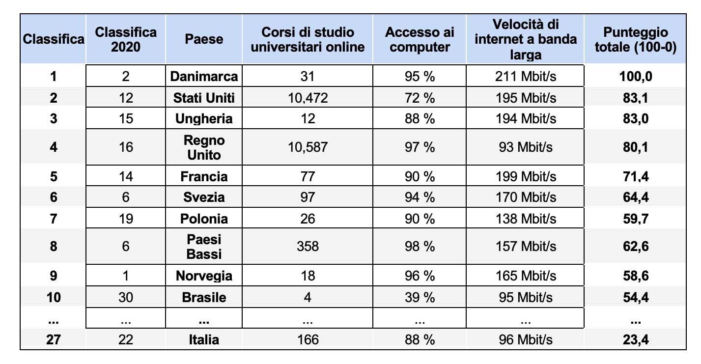 Mentre ad inizio pandemia l’Italia si trovava al 22° posto nel confronto internazionale, la classifica aggiornata (qui i dettagli) rende chiaro che altri paesi hanno fatto un uso migliore dell’opportunità di promuovere l’istruzione digitale e l’e-learning: l’Italia è così scivolata al 27°, superata da Slovacchia, Spagna e Portogallo. Punto di forza dell’Italia è l’alta percentuale di abitazioni che dispongono di un computer (88%).