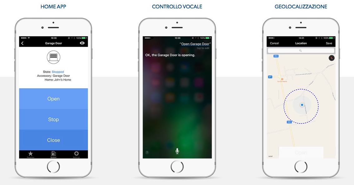 Con Siri è possibile utilizzare il comando vocale per aprire e chiudere la porta da garage mentre, attivando il GPS dell’iPhone, con la geolocalizzazione la porta da garage si aprirà automaticamente quando si è in prossimità della casa e all’esatta distanza richiesta, in modo sicuro e riducendo i tempi di attesa.