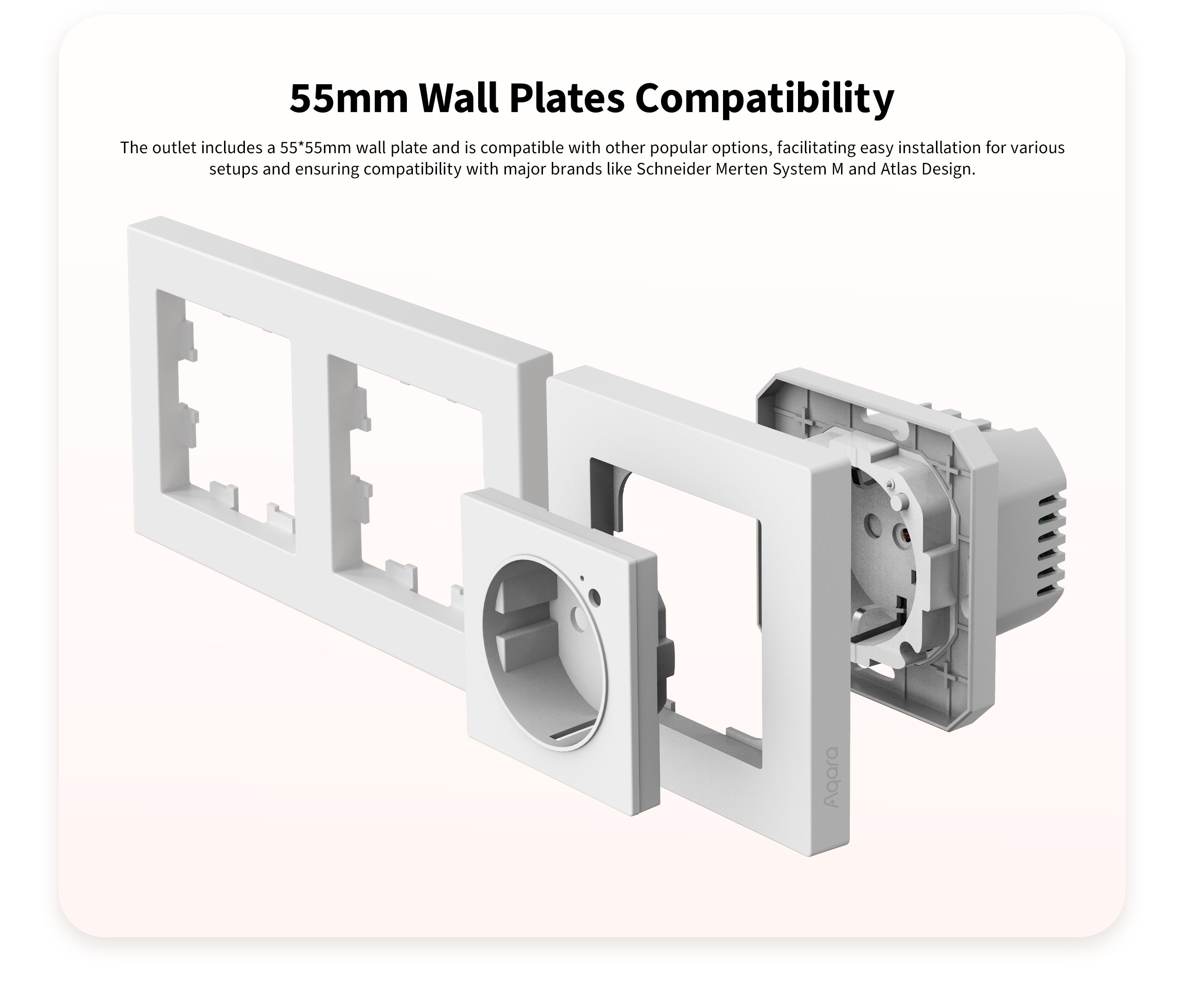 La presa a muro H2 EU di Aqara offre le tecnologie “smart” direttamente nella parete, una soluzione completa ed esteticamente piacevole senza sacrificare la connettività e la funzionalità. Compatibile con le più diffuse piastre a muro da 55 mm, come la gamma Merten System M di Schneider, la presa è versatile e può essere utilizzata sia in configurazioni singole che multi-collegamento.