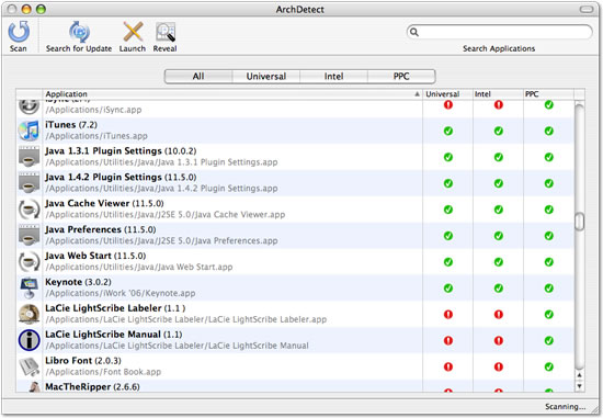 Anche questa applicazione freeware fa quello che deve in modo elementare e efficace. Il tutto avviene nei prevedibili tre passaggi: scaricate, aprite il file immagine, doppio click per avviare et … voilà , il gioco è fatto: in un istante venite a sapere se le vostre applicazioni siano state sviluppate per Intel, PPC o Universal Binary. Sarebbe meglio farlo prima di cambiare il vostro Mac PPC per un Mac Intel nuovo fiammante, ovviamente.