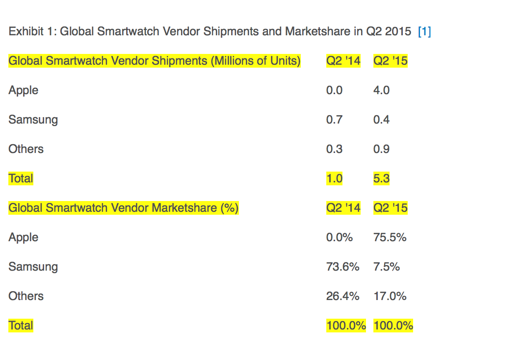 Secondo Strategy Analytics, la società che ha elaborato il dato, da aprile a fine giugno, Cupertino ha venduto circa 4 milioni di Apple Watch mentre il totale del mercato complessivamente è stato di 5,3 milioni di pezzi. Dal debutto dello smartwatch della Mela, Samsung ha quasi dimezzato le vendite, passando da 300mila unità, passando 0,7 milioni a 0,4 milioni di pezzi. Il resto dei concorrenti, non identificati è andato da 0,3 a 0,9 milioni. In assenza di Apple il mondo degli smartwatch sarebbe cresciuto da 1 milione di unità vendute a 1,3 milioni, quindi del 30%, ma il debutto di Apple Watch il balzo in avanti è stato di oltre il 457%.