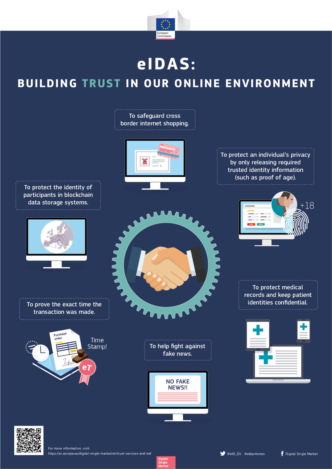 La legislazione a livello dell’UE sull’identificazione elettronica (il regolamento e-IDAS), permetterà il riconoscimento transfrontaliero dei documenti d’identità elettronici (eID) e consentirà ai cittadini e alle imprese dell’UE di accedere a servizi online anche se sono originari di uno Stato membro diverso. Sarà ad esempio possibile presentare dichiarazioni fiscali online, aprire un conto bancario o creare un’impresa a distanza, iscriversi in una scuola ed accedere a dati personali di carattere medico, sempre nel rispetto degli standard di riferimento in materia di protezione dei dati personali.