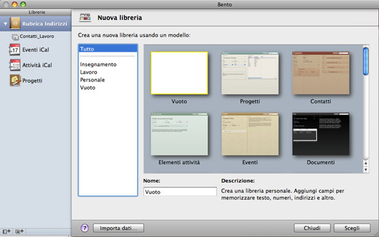 Tutte queste operazioni e la conversione diretta in campi logici vengono eseguiti in modo completamente automatico. Ovviamente l’utente può intervenire per personalizzare, arricchire e migliorare il proprio archivio e il proprio progetto sfruttando gli infiniti vantaggi resi possibili dal passaggio da un “semplice” foglio di lavoro a un programma di database vero e proprio quale è Bento 2. Anche per chi non ha alcuna dimestichezza con i database e non ne ha mai utilizzato uno, iniziare a lavorare con Bento 2 risulta facile come iniziare a usare per la prima volta iTunes.