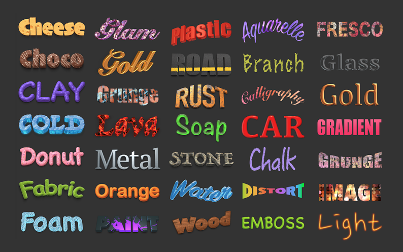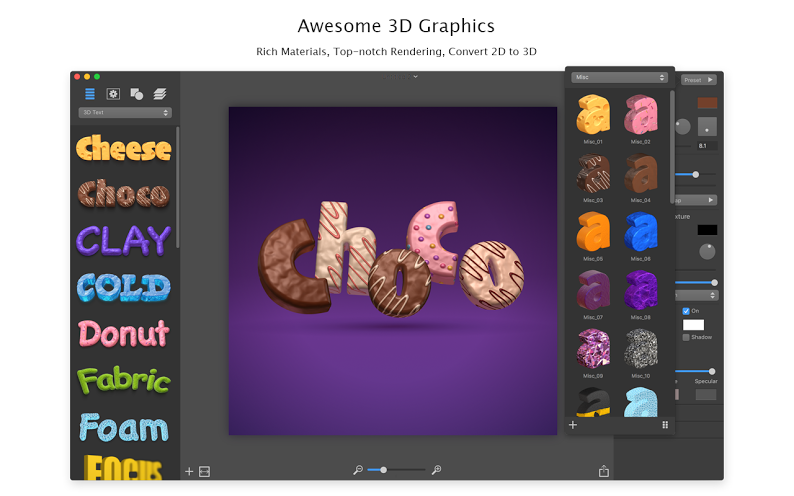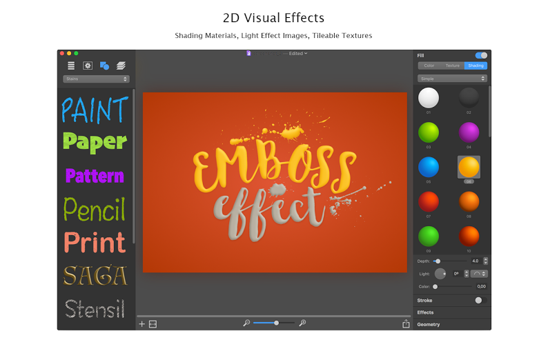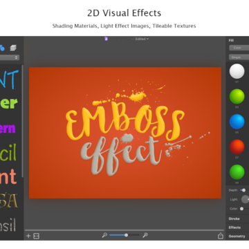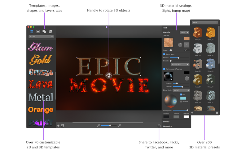 Dalla sezione a sinistra è possibile scegliere tra vari effetti 2D/3D, trasformare il testo in bottone (utile per il web), cambiare la texture dello sfondo, creare effetti di luce. Si possono richiamare figure geometriche (cerchi, quadrati, stelle, triangoli, ecc.) e sfruttare più livelli. Non mancano funzioni per la condivisione su Facebook, Flickr, AirDrop, Mail e altri social e servizi cloud.