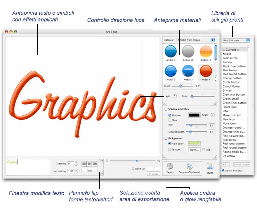 Art Text, giunto ora alla versione 1.3.5, è compatibile con Mac 10.4 e successivi (Leopard incluso).