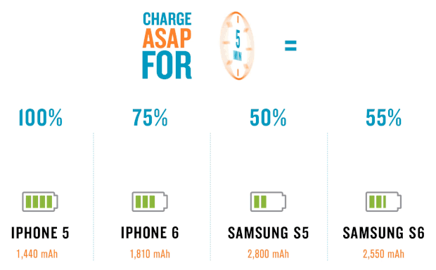 Bastano solamente 5 minuti per ottenere energia sufficiente per una ricarica completa di iPhone 5 o il 75% di iPhone 6. Con 15 minuti invece si ottengono 3 ricariche complete di iPhone 5 o sufficiente per ricaricare oltre due volte iPhone 6. Anche le altre specifiche sono in grado di far impallidire la stragrande maggioranza delle batterie esterne già circolazione o in arrivo: potenza di 3,1 A, capacità di 5.000 mAh, peso di 179 grammi e chassis in alluminio con profilo sottile tanto da essere tascabile.