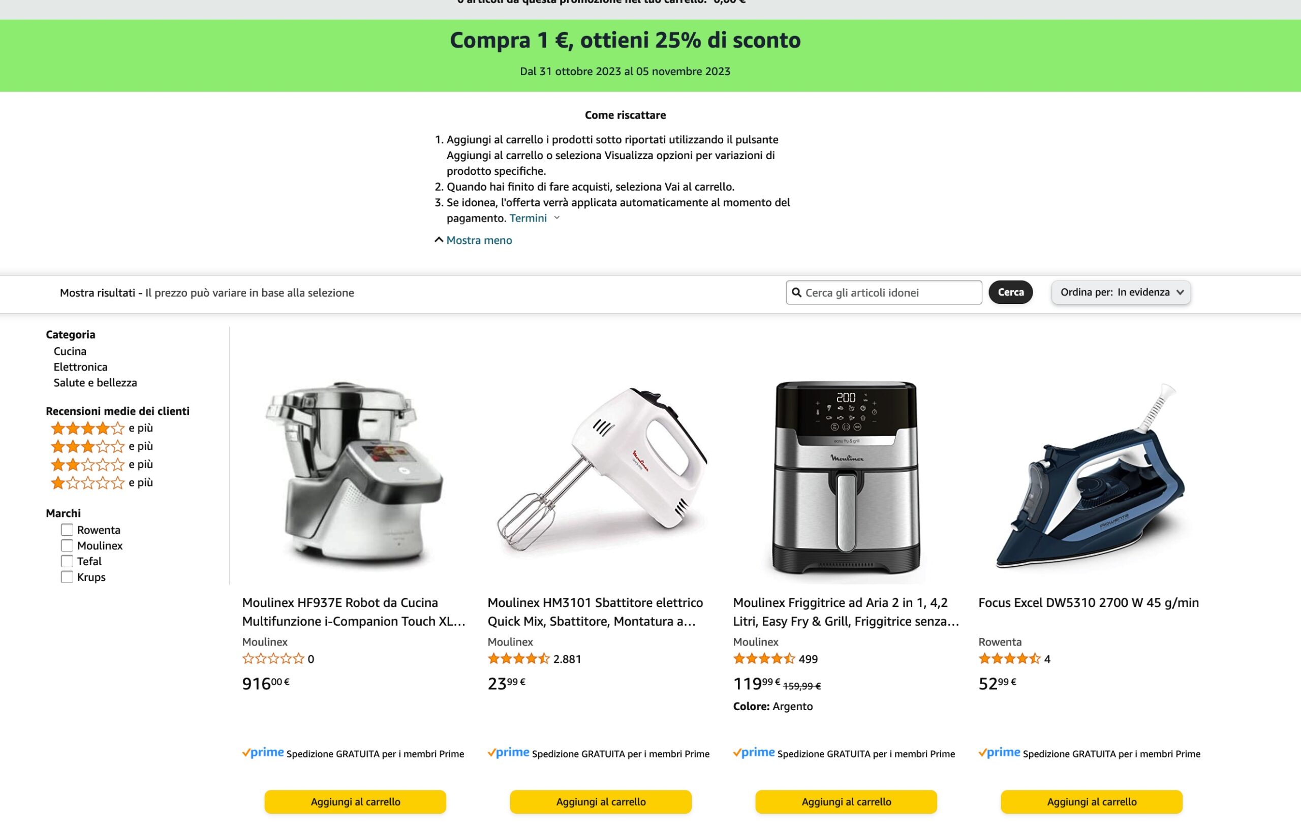 Se state cercando un’offerta importante prima del lancio del Black Friday, un’offerta paragonabile e probabilmente migliore di molte di quelle che troveremo a breve nella grande “festa” degli sconti, date un’occhiata a questa pagina seminascosta di Amazon dove trovate fino a domani, domenica 5 novembre, una serie di accessori e piccoli elettrodomestici per la casa che fanno riferimento al marchio Moulinex con un fortissimo sconto: il 25%.