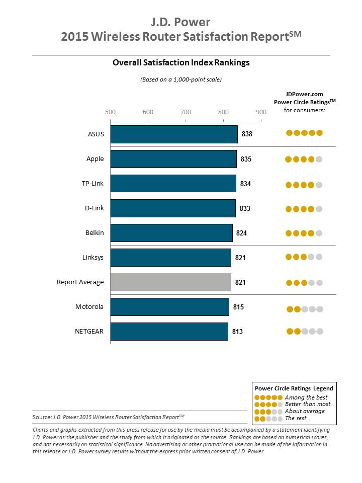 L’indagine ha misurato la soddisfazione generale con i router acquistati negli ultimi 12 mesi, tenendo conto di dieci diversi fattori: portata del segnale Wi-Fi, affidabilità, semplicità di ripristino della connessione, velocità di upload e download, funzionalità di sicurezza, prezzo, facilità d’uso, disponibilità di funzionalità varie, interfaccia utente e servizio clienti. La soddisfazione generale nel 2015 ha segnato un punteggio medio di 821 su una scala da 1 a 1000 collocando al primo posto Asus e al secondo Apple, con le sue Airport e TimeCapsule, davanti a TP-Link