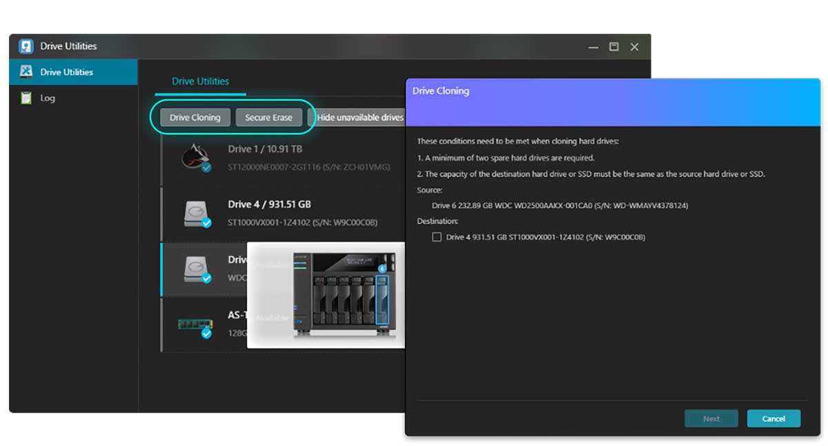 Sfruttando due o più alloggiamenti liberi di un NAS o delle unità di espansione AS6004U o Xpanstor 4, l’utility in questione consente di effettuare in modo semplice e immediato la copia dei dati di un hard disk o di un SSD su un’unità disco di capacità uguale o superiore, consentendo di eseguire il backup rapido dell’intero contenuto della memoria di massa.